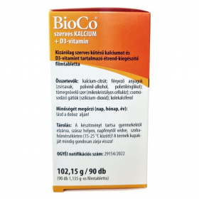 A BioCo szerves Kalcium + D3-vitamin kizárólag szerves kötésű kalcium-citrátot tartalmaz, amely nélkülözhetetlen a normál csontozat és fogazat fenntartásához, részt vesz a normál véralvadási folyamatokban, valamint hozzájárulhat a normális izomműködéshez. A D3-vitamin támogatja a kalcium és foszfor normál felszívódását, valamint az egészséges csontozat és izomfunkció fenntartását. A termék teljes mértékben mentes a szervetlen kalcium vegyületektől, például kalcium-karbonáttól vagy kalcium-oxidtól. A tablettát színezékmentes filmbevonat borítja, amely megkönnyíti a bevételt. Magyar fejlesztésű és gyártású termék, melynek hatóanyagai nem Magyarországról származnak. A „BioCo” kifejezés a gyártó cégnevére utal, nem ökológiai tanúsítást jelent.