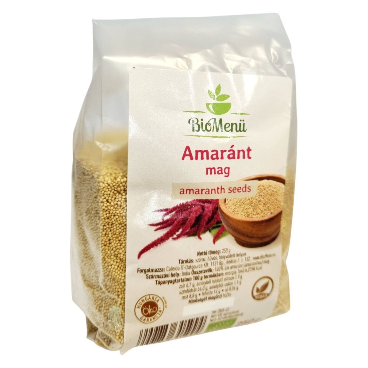 A BioMenü Amaránt mag 100% bio amarántot tartalmaz, amely Indiából származik. A termék vegán és bio minősítéssel rendelkezik, és ideális választás különféle étrendi irányzatok követőinek.