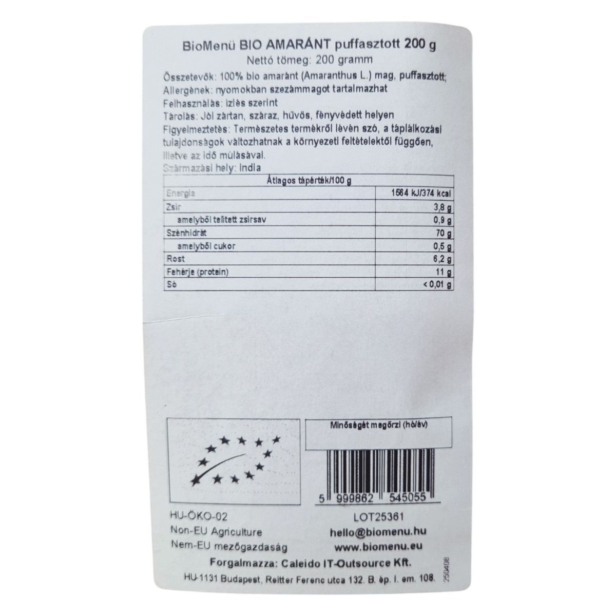 A BioMenü BIO AMARÁNT puffasztott termék 200 grammos kiszerelésben kapható, és 100% bio amaránt magból készül, amelyet puffasztott formában kínálnak. A termék vegán, bio és raw minősítéssel rendelkezik, így ideális választás lehet különböző étrendi irányzatok követőinek. Az amaránt Indiából származik, és a termék nyomokban szezámmagot tartalmaz. A tárolás során fontos, hogy a terméket jól zártan, száraz, hűvös és fényvédett helyen tartsuk. A termék energia- és tápérték adatai alapján kiváló rost- és fehérjeforrás, alacsony cukortartalommal. A termék forgalmazója a Caleido IT-Outsource Kft., és a HU-ÖKO-02 engedélyszámmal rendelkezik.