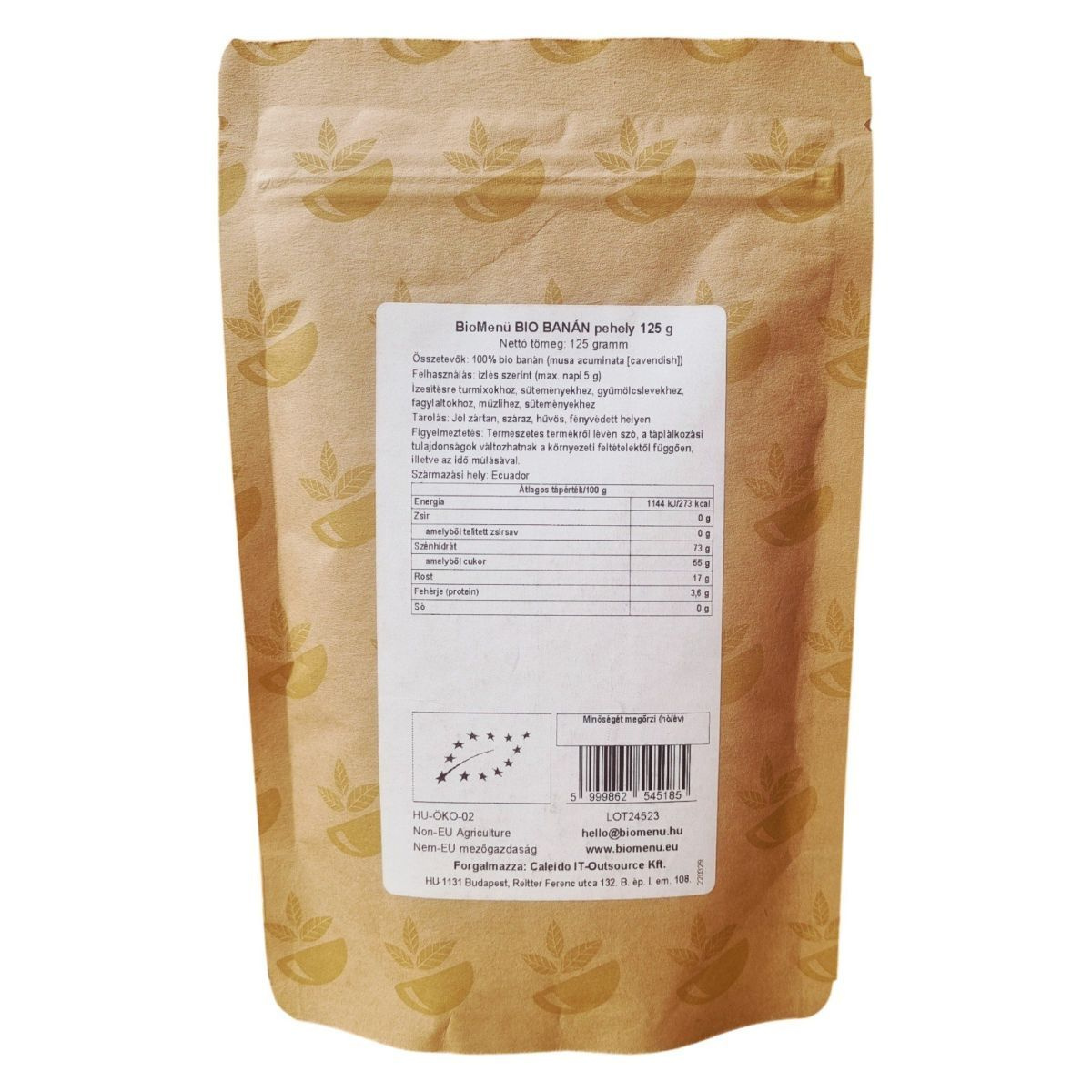 A BioMenü BIO BANÁN pehely egy 100% bio banánból készült termék, amely Ecuadorból származik. A termék vegán, bio és raw minősítésű, és ideális különféle ételek ízesítésére, mint például turmixok, sütemények, gyümölcslevek, fagylaltok és müzlik. A termék táplálkozási tulajdonságai változhatnak a környezeti feltételektől függően, illetve az idő múlásával. A termék forgalmazója a Caleido IT-Outsource Kft., és rendelkezik HU-ÖKO-02 tanúsítvánnyal.