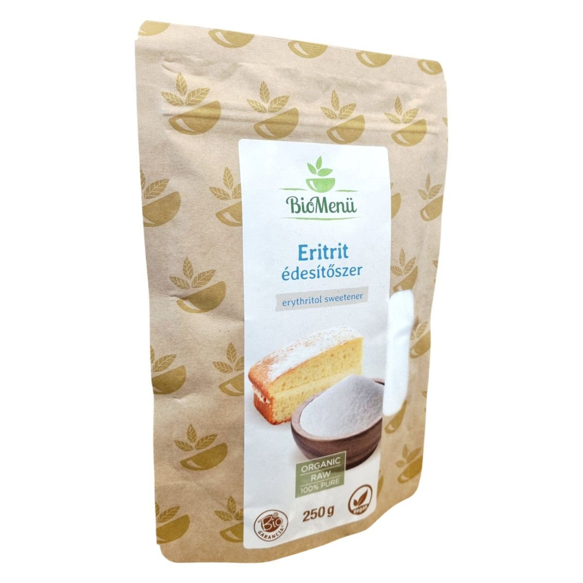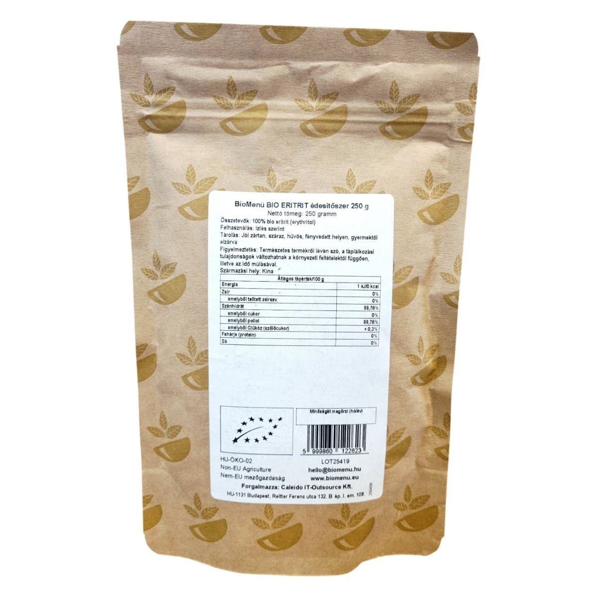 A BioMenü BIO ERITRIT édesítőszer egy 100% tiszta, organikus eritrit, amely Kínából származik. A termék nem tartalmaz zsírt, fehérjét vagy sót, és szénhidráttartalma szinte teljes egészében poliolokból áll. Az eritrit ideális választás azok számára, akik cukormentes alternatívát keresnek. A termék minőségét a HU-ÖKO-02 tanúsítvány garantálja, és a Caleido IT-Outsource Kft. forgalmazza Magyarországon.