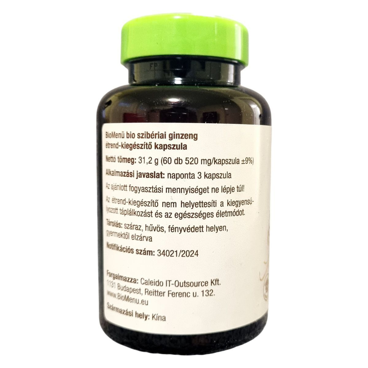 A BioMenü bio szibériai ginzeng étrend-kiegészítő kapszula nettó tömege 31,2 g, amely 60 darab, egyenként 520 mg ±9% tömegű kapszulát tartalmaz. A termékben 100% bio szibériai ginzeng (eleutherococcus senticosus, tajgagyökér) por található, melynek napi adagja három kapszula. A kapszulahéj hidroxi-propil-metil-cellulózból készül, csomósodásgátló anyagként szilícium-dioxidot tartalmaz. A termék származási helye Kína, és nem uniós mezőgazdasági forrásból származik (Non-EU Agriculture). A BioMenü termék bio garanciával, organikus és nyers (raw) minőségben, valamint vegán formában készül.
