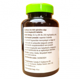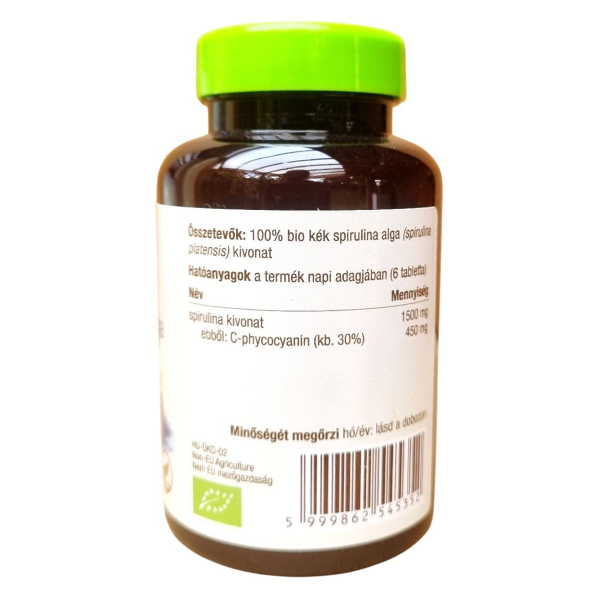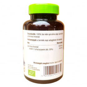 A BioMenü Kék spirulina algatabletta egy organikus, 100% tiszta spirulina kivonatot tartalmazó étrend-kiegészítő, amelyet Kínából származó alapanyagokból készítenek. A termék 90 tablettát tartalmaz, melyek egyenként 250 mg-osak. A spirulina gazdag C-phycocyaninban, amely a napi adagban 450 mg mennyiségben található meg. A termék bio, raw és vegán étrendi irányzatoknak is megfelel. A fogyasztás során fontos betartani az ajánlott mennyiséget, és figyelembe venni a figyelmeztetéseket, különösen dohányzók és azbeszttel dolgozók esetében. A termék forgalmazója a Caleido IT-Outsource Kft., és a termék rendelkezik HU-ÖKO-02 tanúsítvánnyal.
