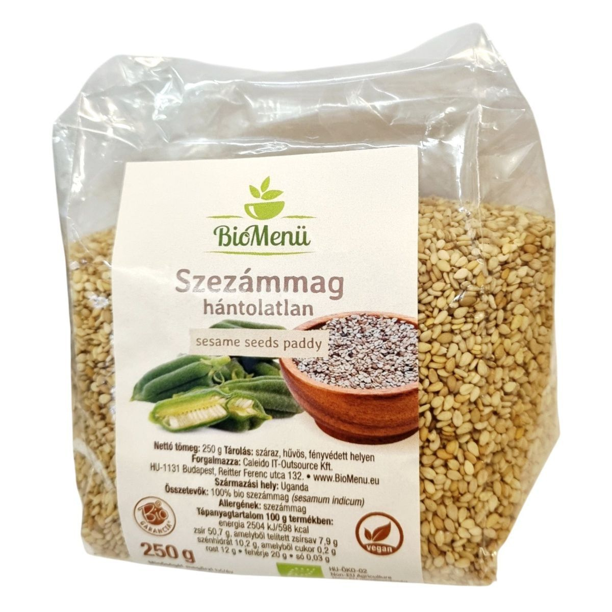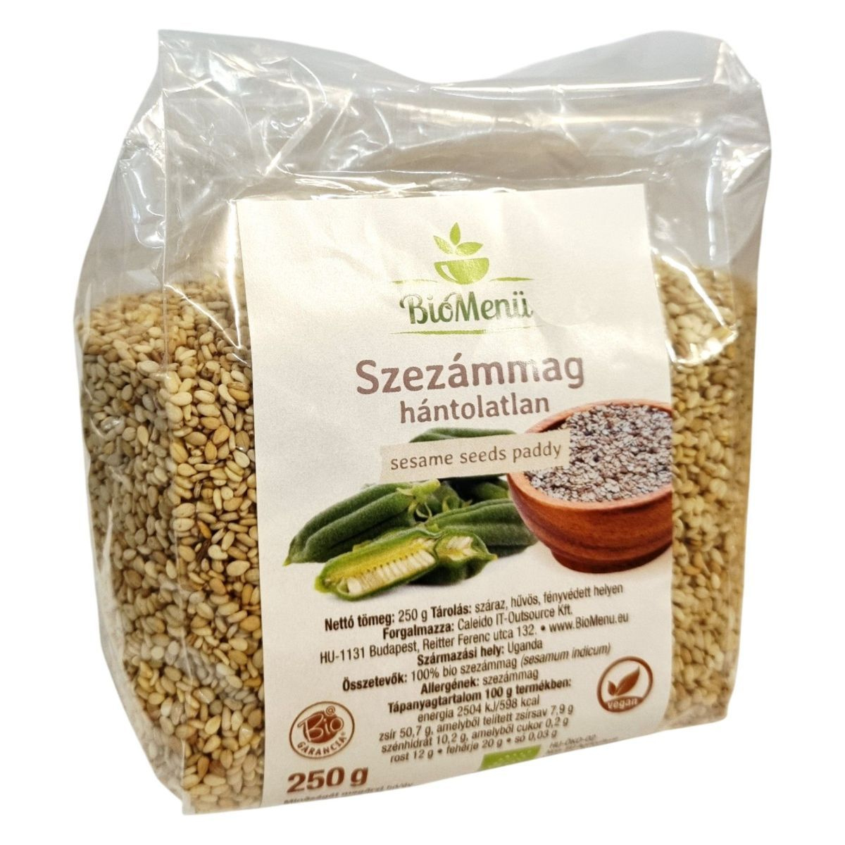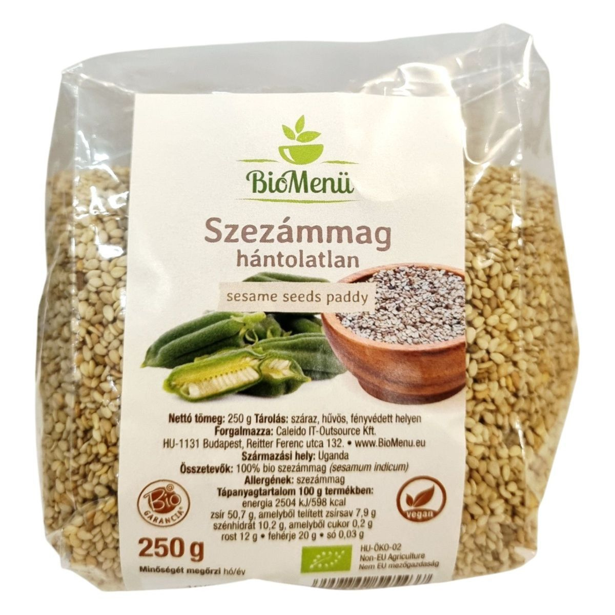 A BioMenü hántolatlan szezámmag egy kiváló minőségű, 100% bio termék, amely Ugandából származik. A termék vegán és bio minősítéssel rendelkezik, és ideális választás azok számára, akik egészséges és természetes alapanyagokat keresnek. A szezámmag gazdag energia- és tápanyagforrás, magas fehérje- és rosttartalommal. A termék csomagolása 250 g-os kiszerelésben kapható, és a Caleido IT-Outsource Kft. forgalmazza. A szezámmag allergénként szerepel, ezért az arra érzékenyeknek körültekintően kell fogyasztaniuk.