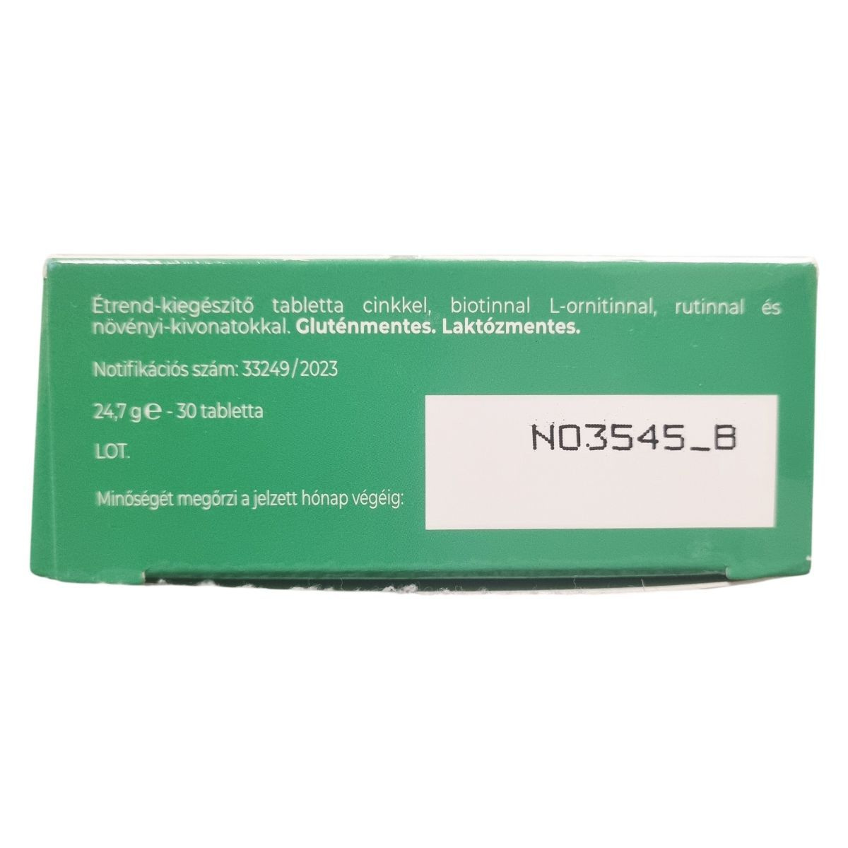 mikrokrisztályos cellulóz, kalcium-foszfát, hidroxi-propil-metil-cellulóz, hidroxi-propil-cellulóz, L-Ornitin-hidroklorid, Reishi (Ganoderma lucidum) sporofóra szárított kivonat, lenmagolaj, cink-biszglicinát, kukorica maltodextrin, articsóka levél szárított kivonat, szilícium-dioxid, zsírsavak magnézium sói, talkum, polidextróz, kalcium-karbonát, Galeopsis föld feletti részek szárított kivonata, rutin, hialuronsav, klorofillin rézkomplexek, közepes láncú trigliceridek, D-Biotin
