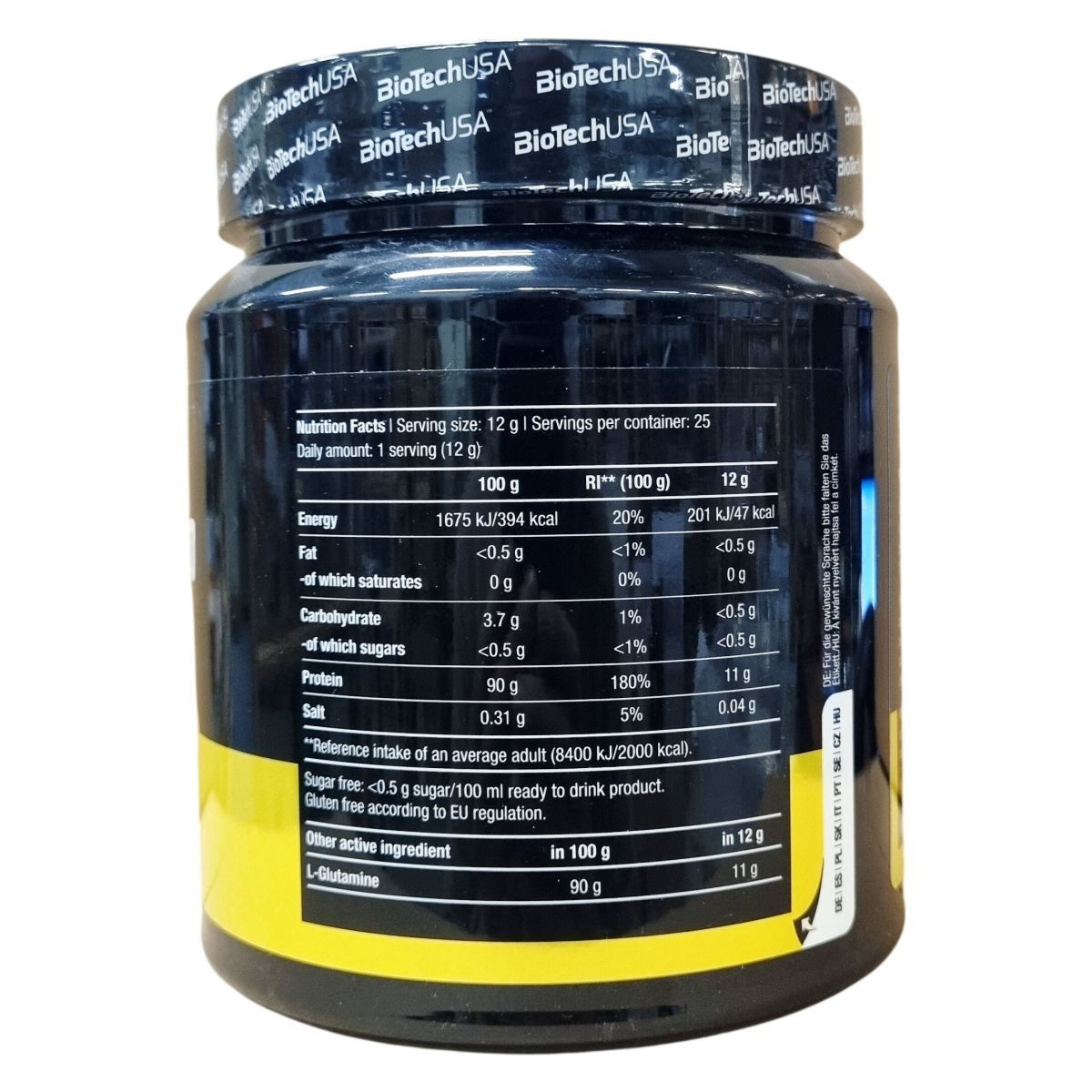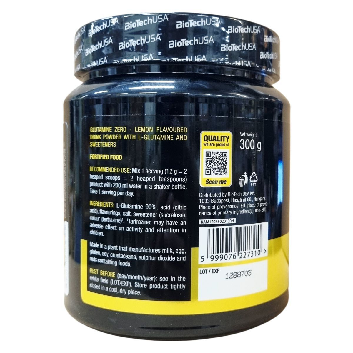 A BioTechUSA Glutamine Zero citrom ízesítésű italpor kifejezetten L-glutaminra fókuszál, amelynek tartalma 90%. A por cukor- és gluténmentes, a 300 grammos csomag 25 adag terméket tartalmaz, amelyeket 12 grammos kiszerelésben ajánlanak használni. A termék savakat, aromákat, sót, szukralózt mint édesítőszert, valamint tartrazin színezéket tartalmaz, ami előfordulhat, hogy kedvezőtlenül befolyásolja a gyerekek figyelmét és aktivitását. A gyártó ezen túlmenően feltünteti, hogy a készítmény olyan üzemben készül, ahol számos allergén is jelen lehet. A komponensek eredete részben EU-n kívüli forrásból származik. A termék kiszerelése praktikus, egy adagolással 200 ml vízben készíthető el, és a javasolt napi adag egy adag. A BioTechUSA erre a termékre a megszokott minőségi szabványokat alkalmazza.