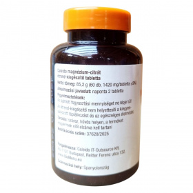 A Caleido Magnézium-citrát tabletta Spanyolországból származik, és 60 tablettát tartalmaz. A termék célja, hogy szerves magnéziumot biztosítson a szervezet számára, amely hozzájárulhat az izomműködés és az idegrendszer normál működéséhez. A termék forgalmazója a Caleido IT-Outsource Kft., és a notifikációs száma 37628/2025. A tabletták nettó tömege 85,2 g, és a termék minőségét a dobozon feltüntetett időpontig őrzi meg.