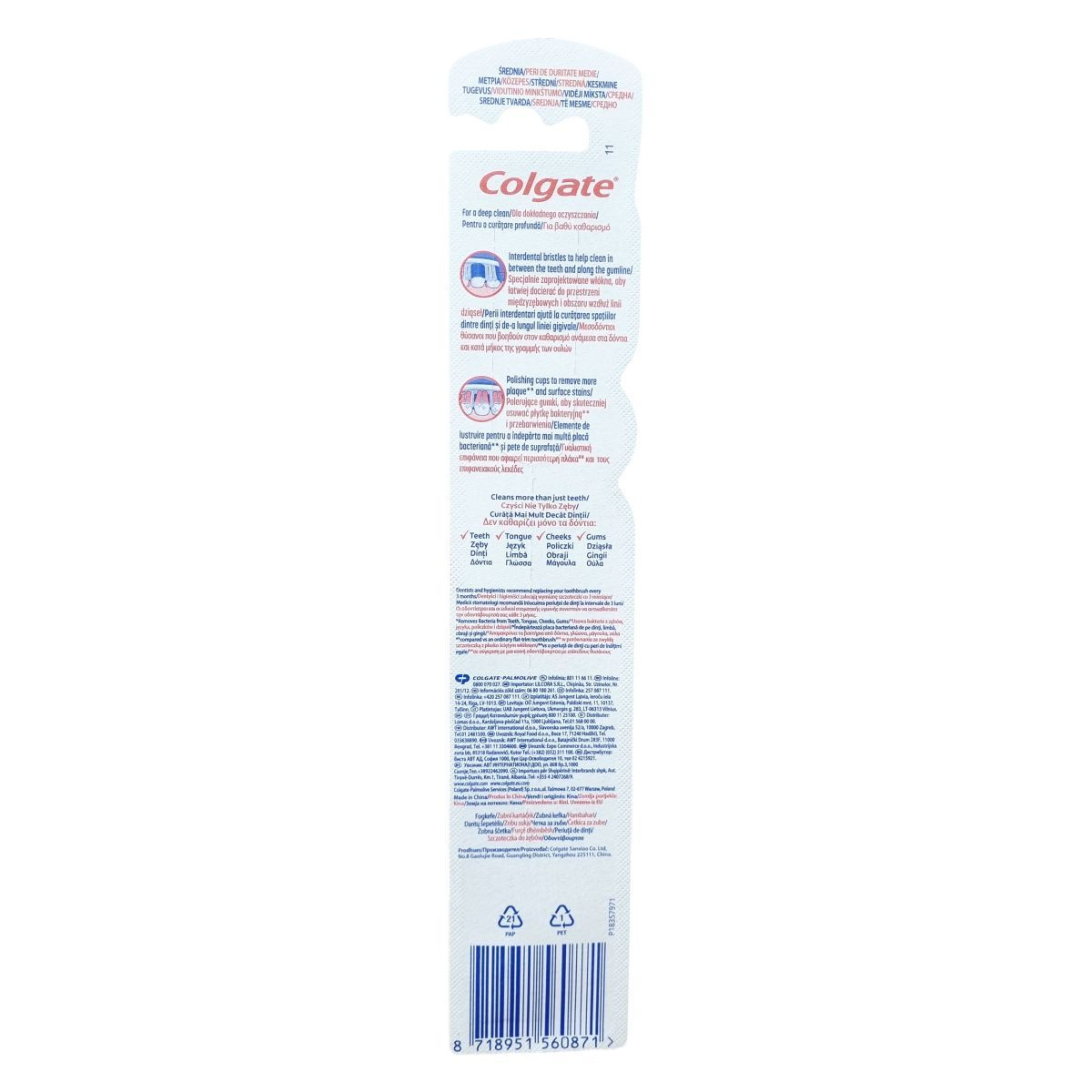 A Colgate Medium fogkefe közepes keménységű sörtékből áll, melyeket kifejezetten a fogak mély és alapos tisztítására terveztek. A 4 az 1-ben megoldás a baktériumok eltávolítását célzó összetétel által nemcsak a fogakat, hanem a nyelvet, az ínyt és az arc belső felületét is tisztítja. A polírozó gumilemezek hatékonyan távolítják el a lepedéket és a felszíni elszíneződéseket, míg az interdentalis sörték gondoskodnak a fogközök és az ínyszél megfelelő tisztításáról. A termék gyártása Kínában, a Colgate Sanxiao Co., Ltd. telephelyén történik.