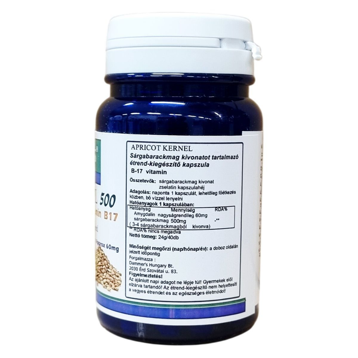 Hatóanyagok 1 kapszulában: Amygdalin nagyságrendileg 60mg, sárgabarackmag (3-4 sárgabarackmagból kivonva) 500mg.