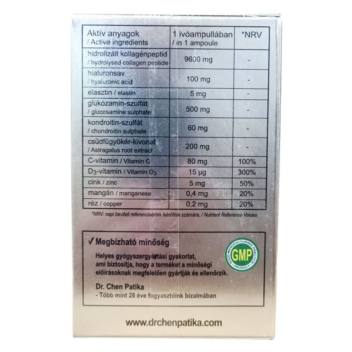 hidrolizált kollagénpeptid, őszibarack juice, glükózamin-szulfát, csüdfügyökér-kivonat (Astragalus), hialuronsav, kondroitin-szulfát, L-aszkorbinsav (C-vitamin), cink-oxid, édesítőszer: steviol-glikozid, stabilizátor: szorbit, étkezési sav: citromsav, elasztin, mangán-szulfát, réz-oxid, kolekalciferol (D3-vitamin)