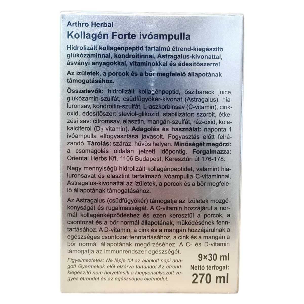 Az Arthro Herbal Kollagén Forte ivóampulla olyan étrend-kiegészítő, amely hidrolizált kollagénpeptideket, glükózamint, kondroitint, Astragalus-kivonatot, valamint vitaminokat és ásványi anyagokat tartalmaz. Kiemelt mennyiségű hialuronsavat és elasztint is tartalmaz, melyek hozzájárulhatnak az ízületek, porcok és bőr megfelelő állapotának támogatásához. Az Astragalus (csüdfügyökér) segítheti az ízületek mozgékonyságát és rugalmasságát. A C-vitamin hozzájárulhat a normál kollagénképződéshez, ezzel támogatva a porcok, csontozat és bőr normál működését. A D-vitamin, cink és mangán hozzájárulhatnak a csontozat egészségének megőrzéséhez, míg a cink és mangán a bőr normál állapotának fenntartásában játszhat szerepet. A C- és D-vitamin az immunrendszer működését is támogathatja. Az ivóampullák édesítőszerrel készülnek, és a használat előtt fel kell rázni őket. A termék a minőségi előírások szerint, helyes gyógyszergyártási gyakorlat betartásával készül, hosszú évek óta megbízható a fogyasztók körében.