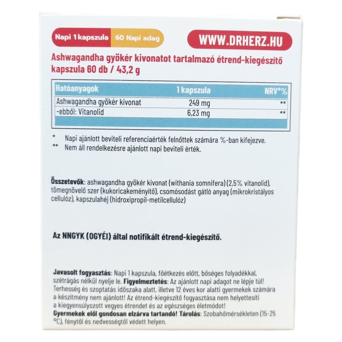 Összetevők: ashwagandha gyökér kivonat (withania somnifera) (2,5% vitanolid), tömegnövelő szer (kukoricakeményítő), csomósodást gátló anyag (mikrokristályos cellulóz), kapszulahéj (zselatin).