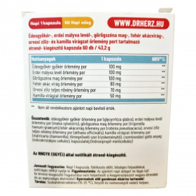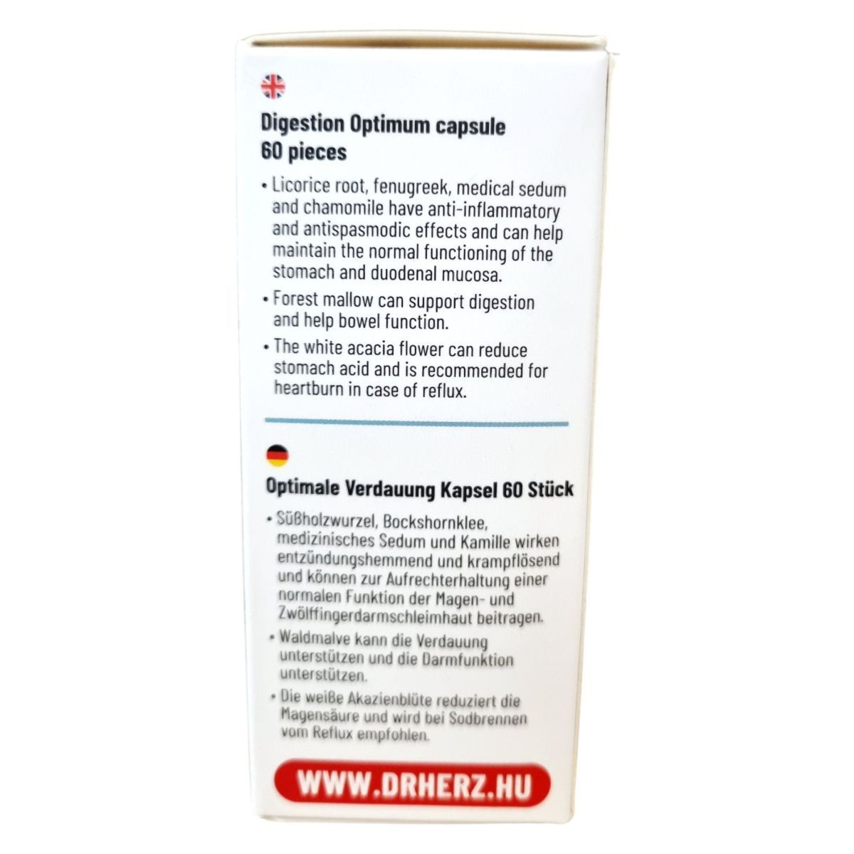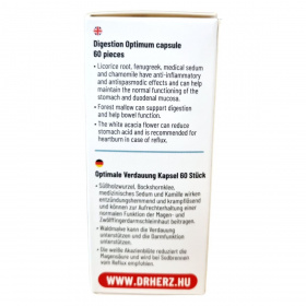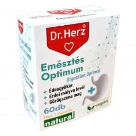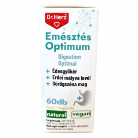 A Dr. Herz Emésztés Optimum kapszula természetes összetevői, mint az édesgyökér, erdei mályva, görögszéna, fehér akácvirág, orvosi ziliz és kamilla, hozzájárulhatnak az emésztés támogatásához és a gyomor-bélrendszer normál működésének fenntartásához. Az édesgyökér, görögszéna, orvosi ziliz és kamilla gyulladáscsökkentő és görcsoldó hatású lehet, míg az erdei mályva és fehér akácvirág segíthet a gyomorsav csökkentésében és a reflux okozta gyomorégés enyhítésében. A termék vegán étrendbe illeszthető, és napi egy kapszula fogyasztása ajánlott.