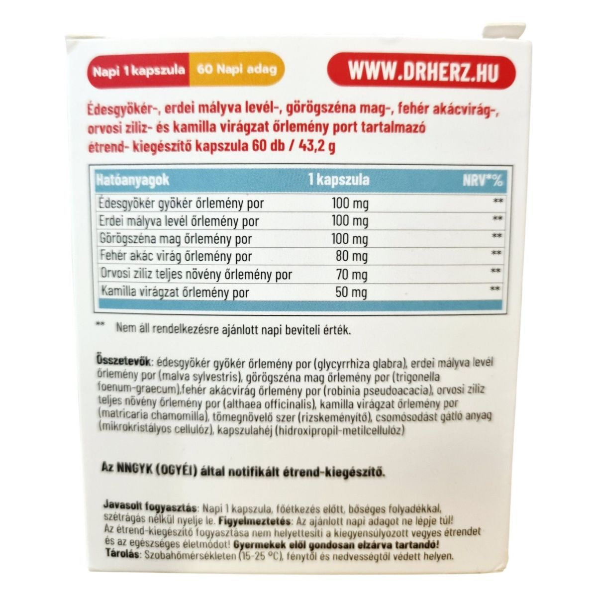 édesgyökér gyökér őrlemény por (glycyrrhiza glabra), erdei mályva levél őrlemény por (malva sylvestris), görögszéna mag őrlemény por (trigonella foenum-graecum), fehér akácvirág őrlemény por (robinia pseudoacacia), orvosi ziliz (althaea officinalis), kamilla virágzat őrlemény por (matricaria chamomilla), tömegnövelő szer (rizskeményítő), csomósodást gátló anyag (mikrokristályos cellulóz), kapszulahéj (hidroxipropil-metilcellulóz)