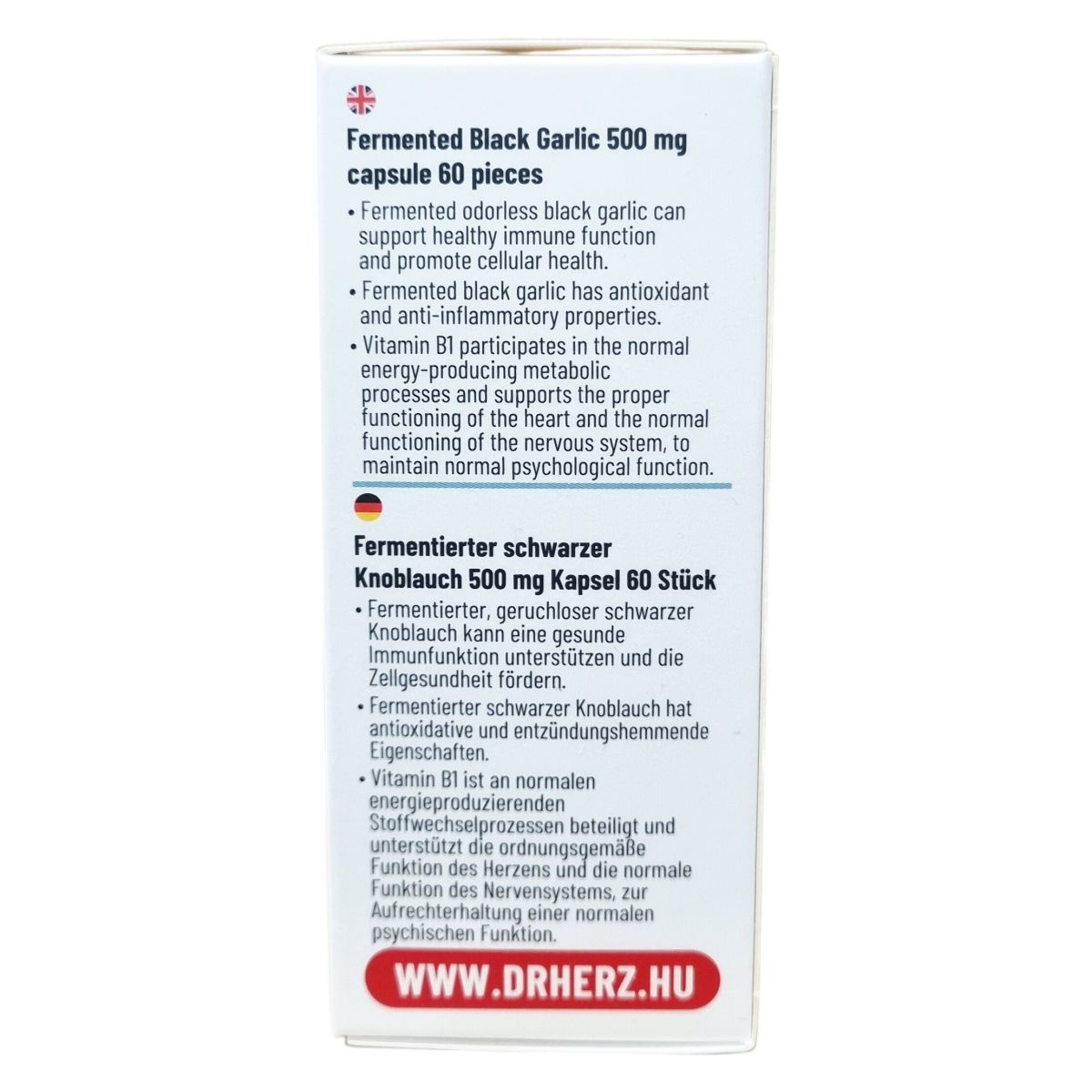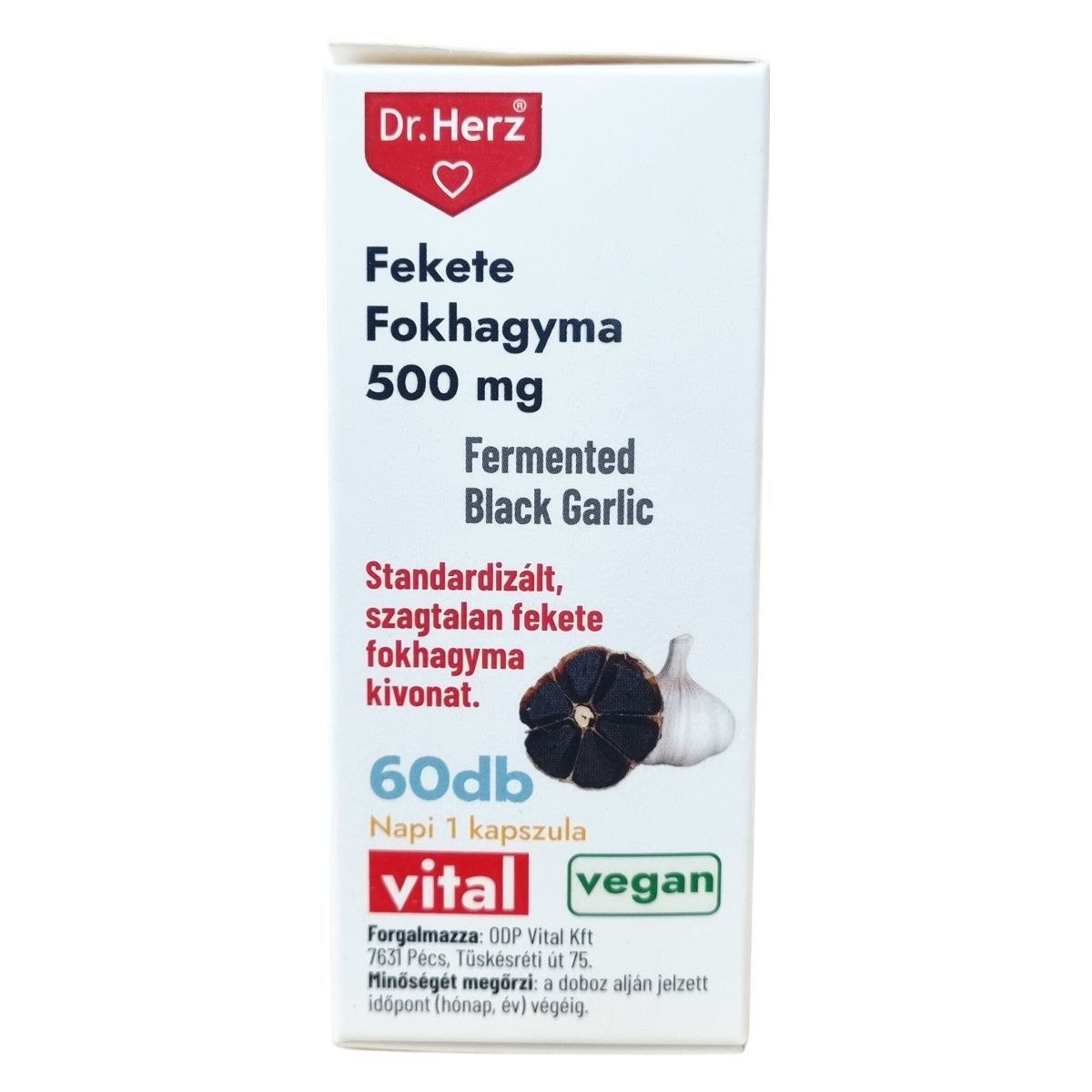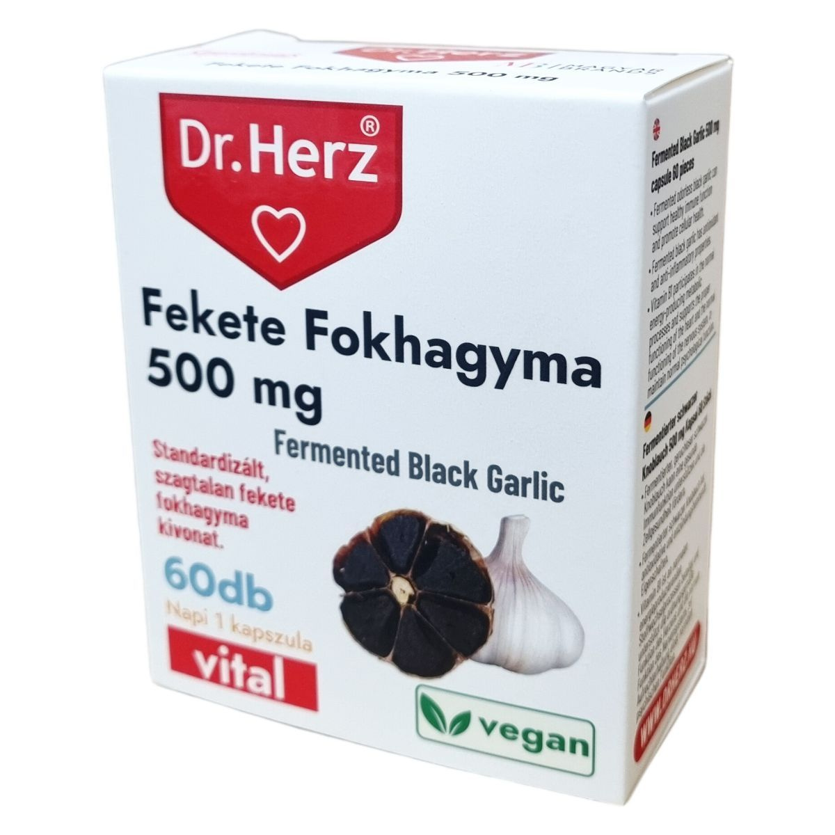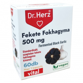 A Dr. Herz készítménye fekete fokhagyma-kivonatot tartalmaz 10:1 arányban, ami 500mg friss növényi őrleménynek felel meg. A fokhagyma vérnyomáscsökkentő, baktérium- vírus- és gombaellenes, emésztést elősegítő, bélfertőtlenítő, bélféregűző, epe- és májműködést elősegítő hatású lehet.