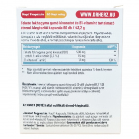 Hatóanyagok 1 kapszulában: Fekete fokhagyma gumó kivonat (10:1) 500mg, ebből S-allil cisztein (0,3%): 1,5mg, B1-vitamin (Tiamin): 1,1mg.