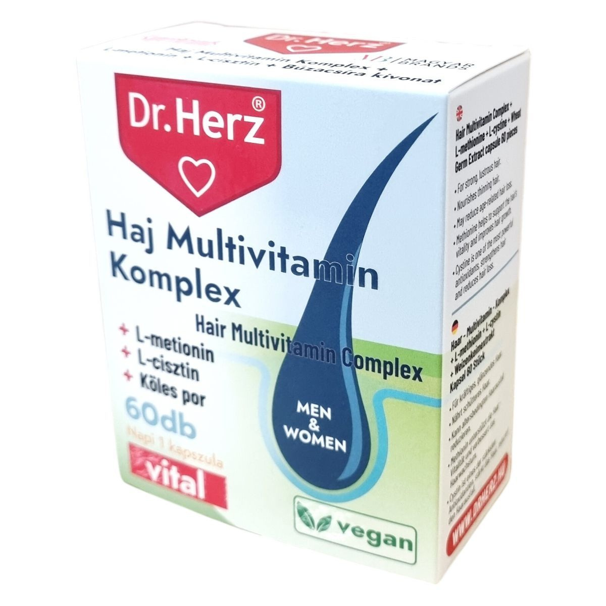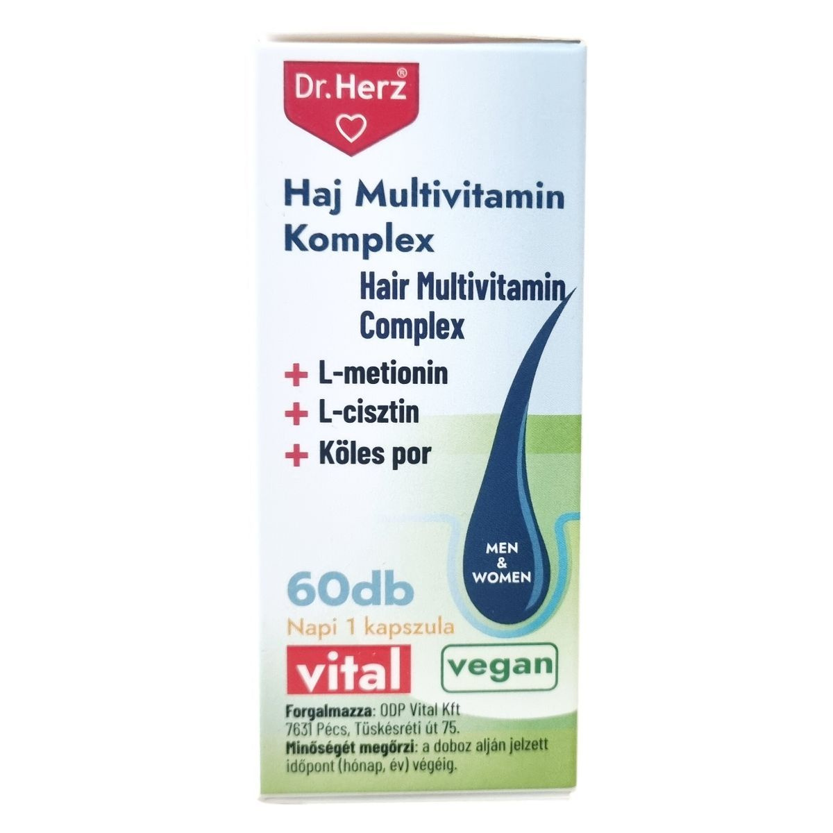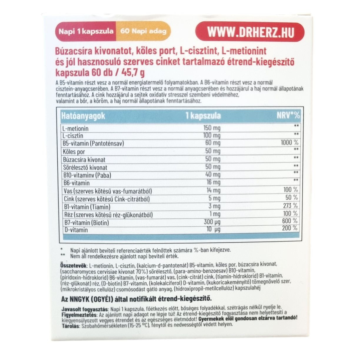 A Dr.Herz Haj Multivitamin Komplex speciális étrend-kiegészítő kapszula, amely búzacsíra kivonatot, köles port, L-cisztint, L-metionint és jól hasznosuló szerves cinket tartalmaz. A B5-vitamin részt vehet a normál energiatermelő folyamatokban, míg a B6-vitamin hozzájárulhat a normál cisztein-anyagcseréhez. A B7-vitamin a normál anyagcserében játszhat szerepet, és támogathatja a haj normál állapotának fenntartását. A cink védelmet nyújthat a sejtek oxidatív stresszel szemben, valamint hozzájárulhat a bőr, köröm és haj egészségéhez. A készítmény L-metionin és L-cisztin tartalma elősegítheti a haj vitalitását és erősítését, miközben antioxidáns hatású lehet. A kapszula napi egyszeri adagolásra ajánlott, vegán összetétele révén széles körben alkalmazható a haj ápolására és támogatására.