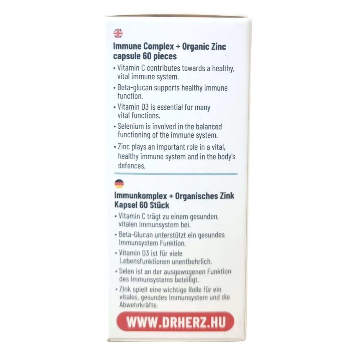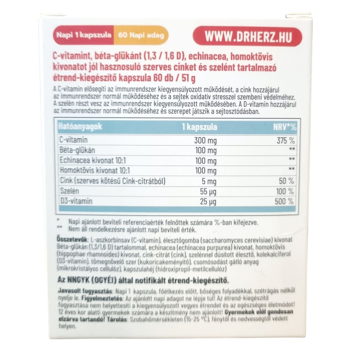 A Dr.Herz Immun Komplex kapszula C-vitamin elősegítheti az immunrendszer kiegyensúlyozott működését, a cink hozzájárulhat az immunrendszer normál működéséhez és a sejtek oxidatív stresszel szembeni védelméhez. A szelén részt vehet az immunrendszer kiegyensúlyozott működésében, míg a D-vitamin támogathatja az immunrendszer normál működését és szerepet játszhat a sejtosztódásban. A béta-glükán, az echinacea és a homoktövis kivonat hatóanyagai szintén hozzájárulhatnak az egészséges immunfunkcióhoz. A kapszula jól hasznosuló szerves cinket tartalmaz cink-citrát formájában, emellett szelénnel dúsított élesztőt és D3-vitamint is. A készítmény napi 1 kapszulás adagolásával könnyen beilleszthető a mindennapi táplálkozásba, azonban az étrend-kiegészítő nem helyettesíti a kiegyensúlyozott étrendet és az egészséges életmódot.