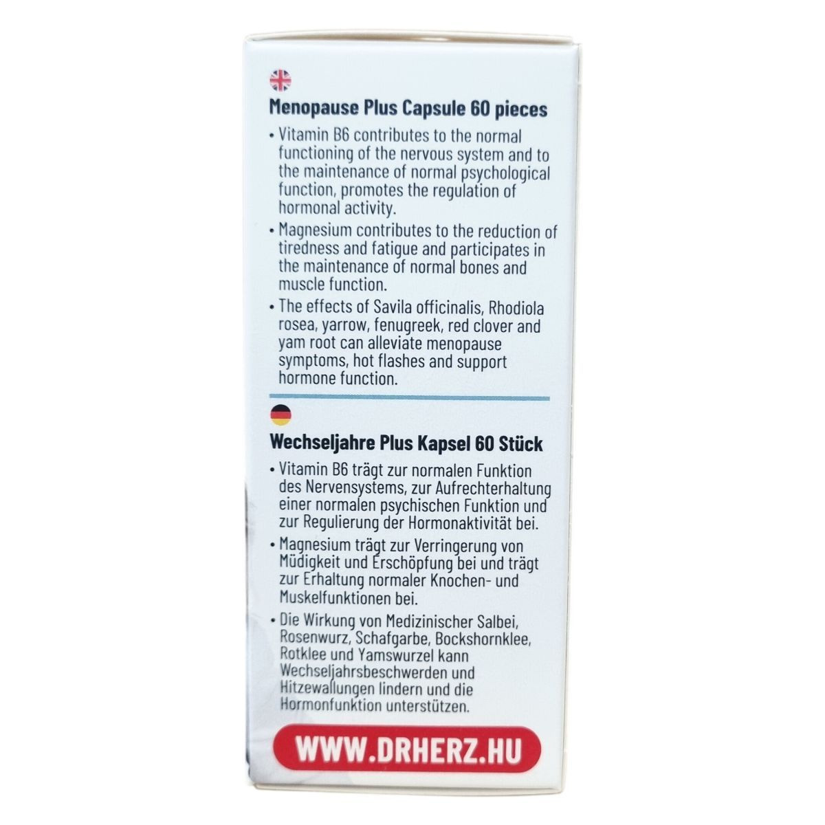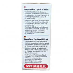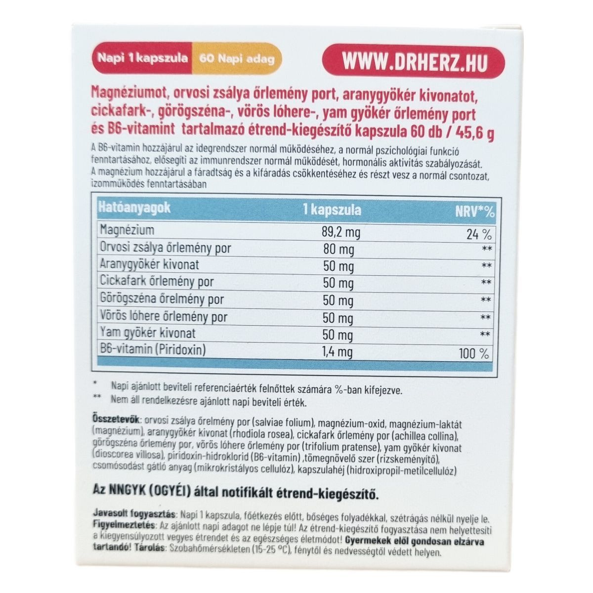 Magnéziumot, orvosi zsálya őrlemény port, aranygyökér kivonatot, cickafark-, görögszéna-, vörös lóhere-, yam gyökér őrlemény port és B6-vitamint tartalmazó étrend-kiegészítő kapszula.