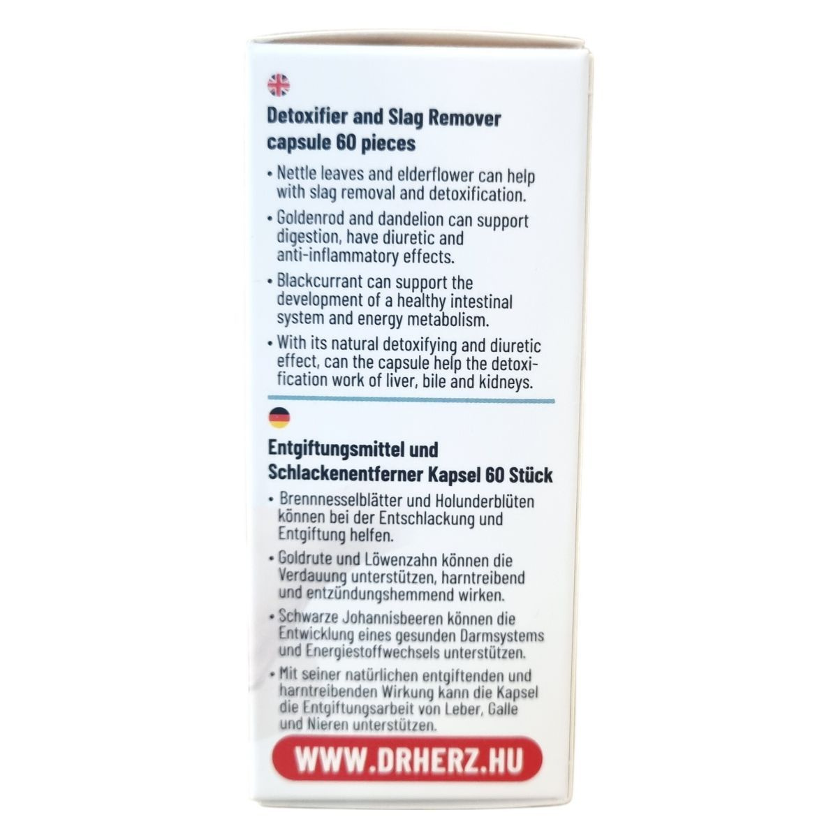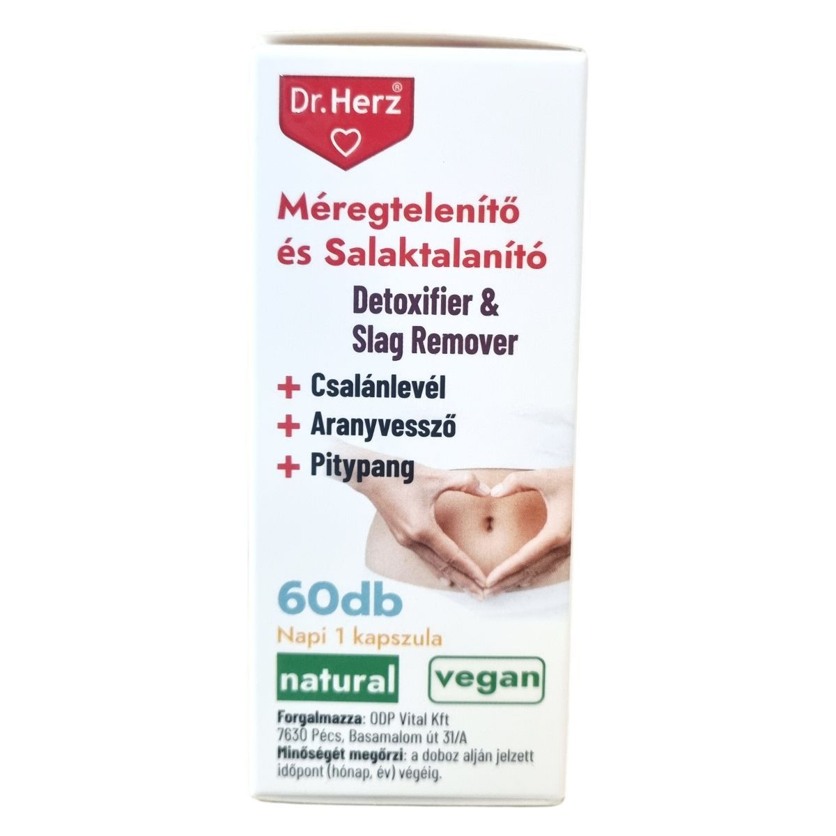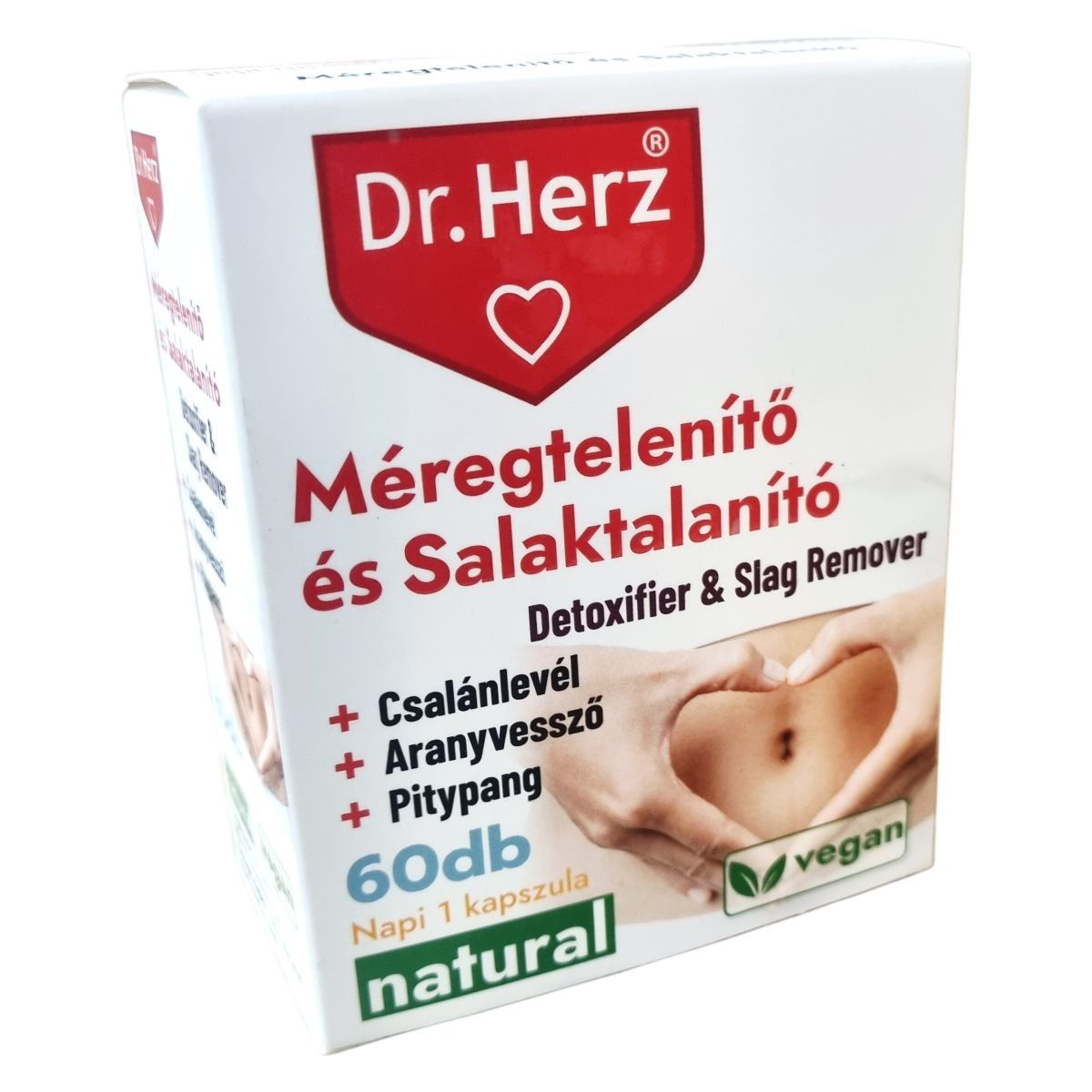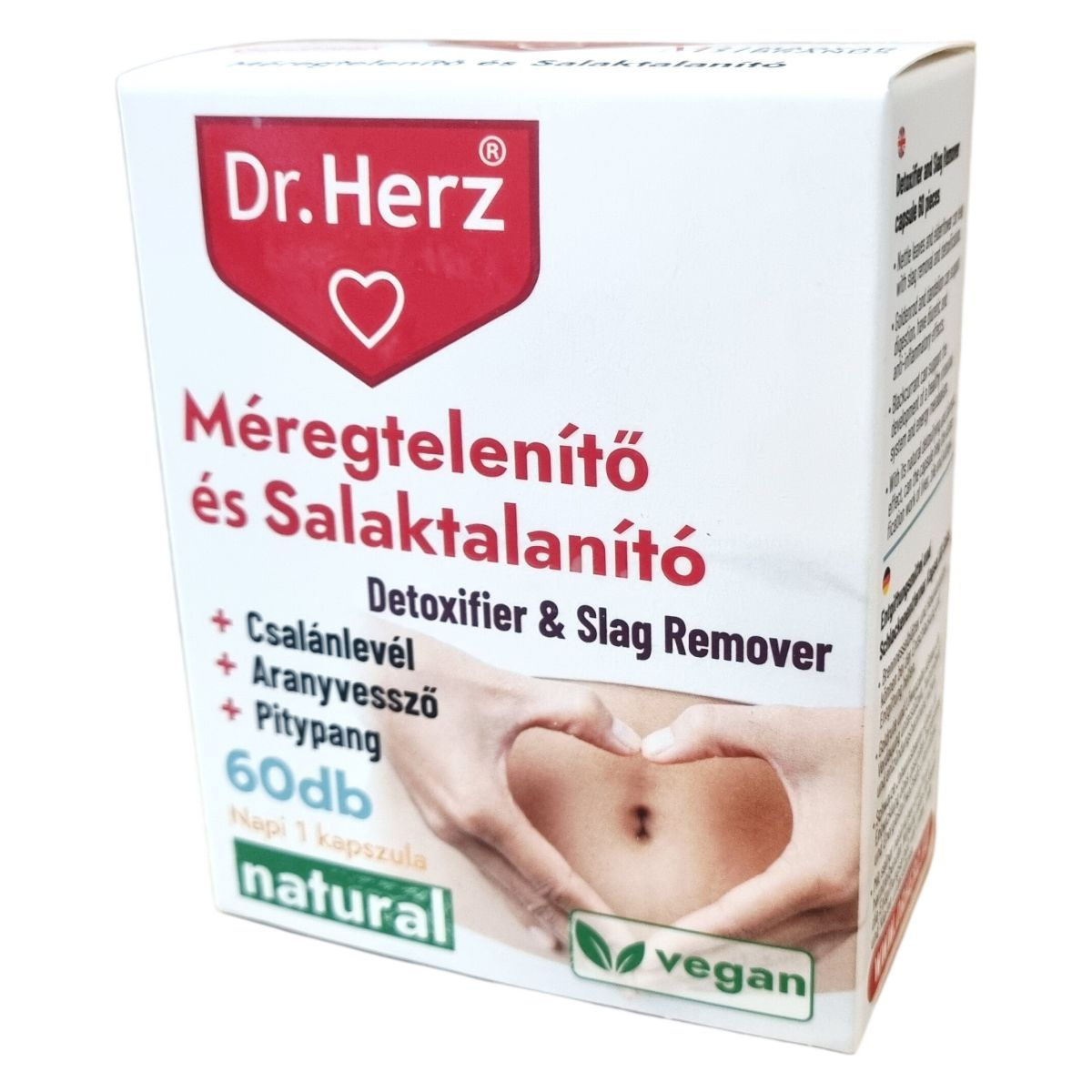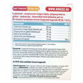 A Dr.Herz Méregtelenítő és Salaktalanító kapszula növényi eredetű hatóanyagokat, például csalánlevél, aranyvessző virágos hajtás, pitypang levél és gyökér, bodzavirág, valamint feketeribizli levél őrleményeket tartalmaz. A készítmény B6-vitamint is magában foglal, amely szerepet játszhat az anyagcsere folyamatokban. A kapszula támogatja a szervezet méregtelenítő funkcióit, különösen a máj, az epe és a vesék működését, természetes detoxifikáló és diuretikus hatása révén. Az összetevők hatásai között megtalálhatóak a salaktalanítás, az emésztés segítése, illetve a gyulladáscsökkentő hatás is. Fontos, hogy a termék használata mellett az ajánlott napi mennyiséget be kell tartani, és nem helyettesíti az egészséges életmódot vagy a kiegyensúlyozott étrendet.