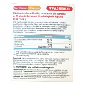 nikotinamid-ribozid-klorid, transz-resveratrol, Japánakác virág kivonat (Sophora japonica flos) (40V/V% ethanol), 95% a bio-kvercetin, kolekalciferol (D3-vitamin), tömegnövelő szer (rizskeményítő), csomósodást gátló anyag (mikrokristályos cellulóz), kapszulahéj (hidroxipropil-metilcellulóz)