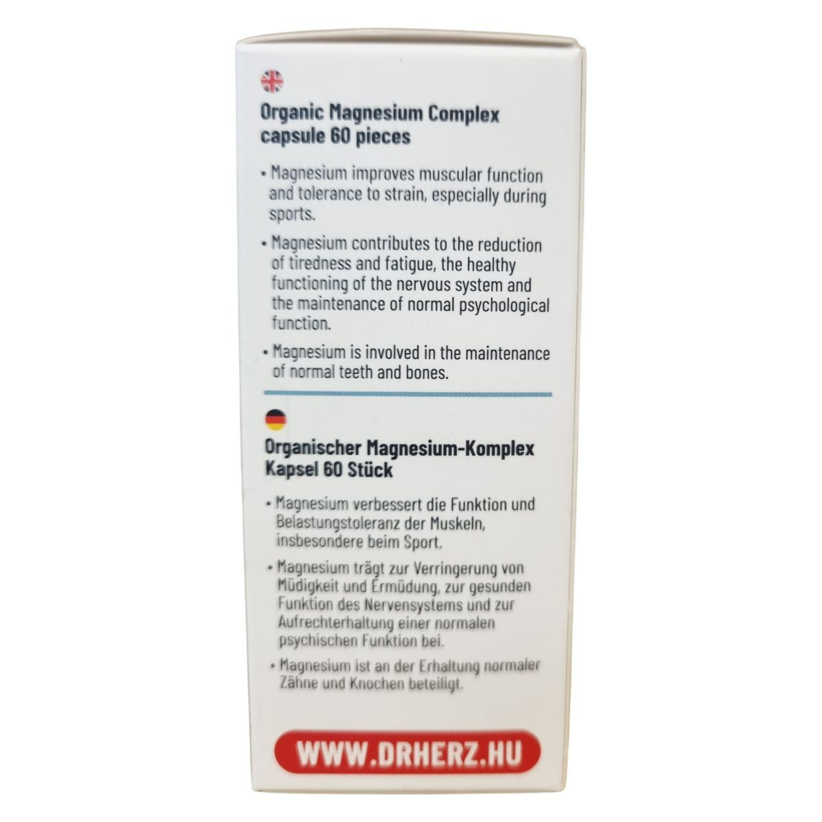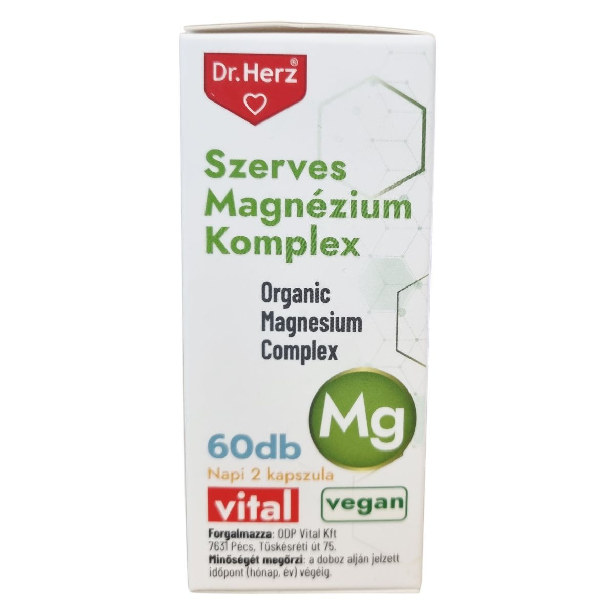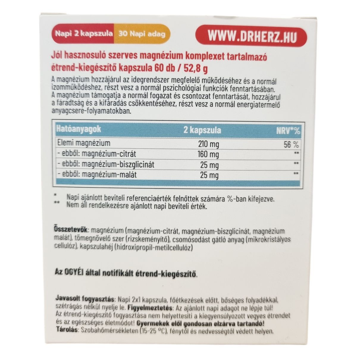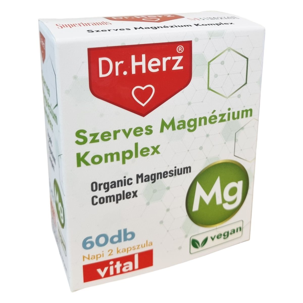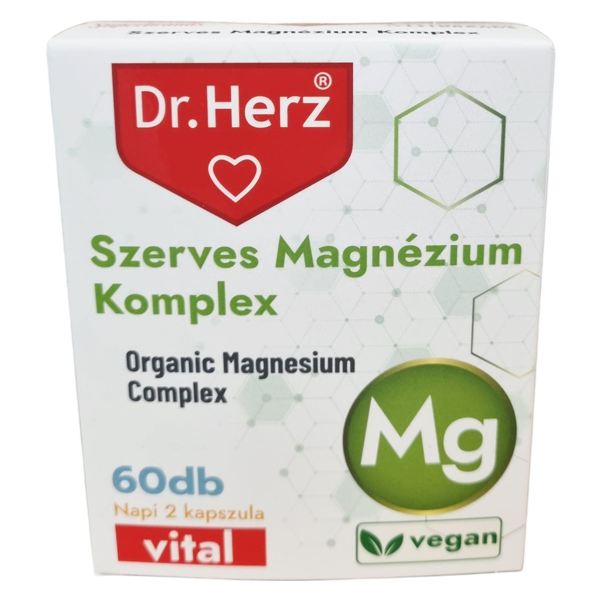 A Dr.Herz® Szerves Magnézium Komplex kapszula jól hasznosuló szerves magnézium forrásokat tartalmaz, mint a magnézium-citrát, magnézium-biszglicinát és magnézium-malát. A magnézium hozzájárulhat az idegrendszer megfelelő működéséhez, a normál izomműködés fenntartásához, és részt vehet a pszichológiai funkciók fenntartásában. Emellett támogathatja a fogazat és a csontok egészségének megőrzését, csökkentheti a fáradtságot és kimerültséget, illetve részt vehet az energiatermelő anyagcsere-folyamatokban. A készítmény vegán étrendet követők számára is alkalmas, és kapszula formában, napi két alkalommal ajánlott fogyasztani főétkezések előtt, bőséges folyadékkal. Az étrend-kiegészítő nem helyettesíti a kiegyensúlyozott táplálkozást és egészséges életmódot, és gyermekek elől gondosan el kell zárni.
