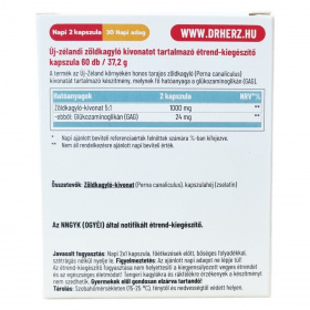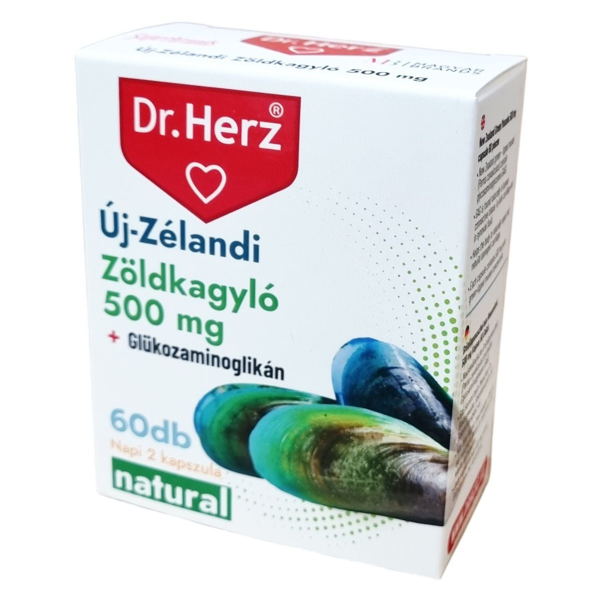 A Dr.Herz Új-Zélandi Zöldkagyló készítmény az Új-Zéland környékén honos tarajos zöldkagyló (Perna canaliculus) kivonatát tartalmazza, melynek fő hatóanyaga a glükozaminoglikán (GAG). A GAG természetesen előfordul az emberi kötőszövetekben, ízületi porcszövetben és szinoviális folyadékban. Ez az összetevő segítheti a szervezet természetes folyamatát a sérült porc javításában és újjáépítésében. Minden kapszula 500 mg tiszta zöldkagyló-koncentrátumot tartalmaz. Az étrend-kiegészítő napi két kapszulás adagolása javasolt.