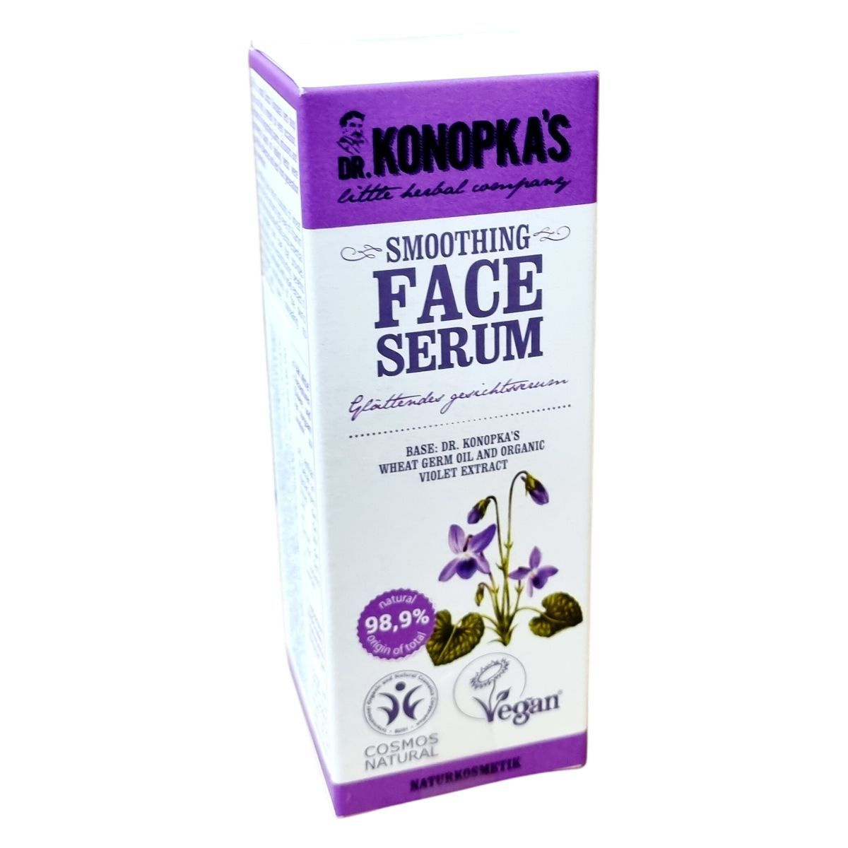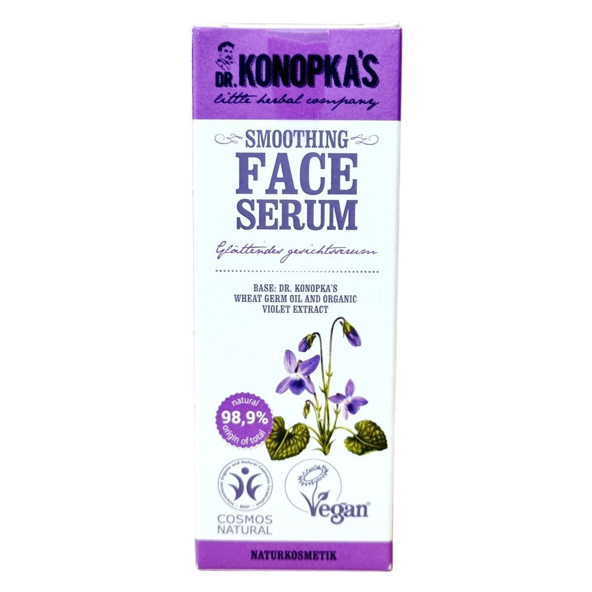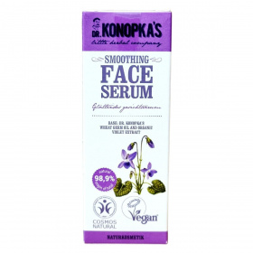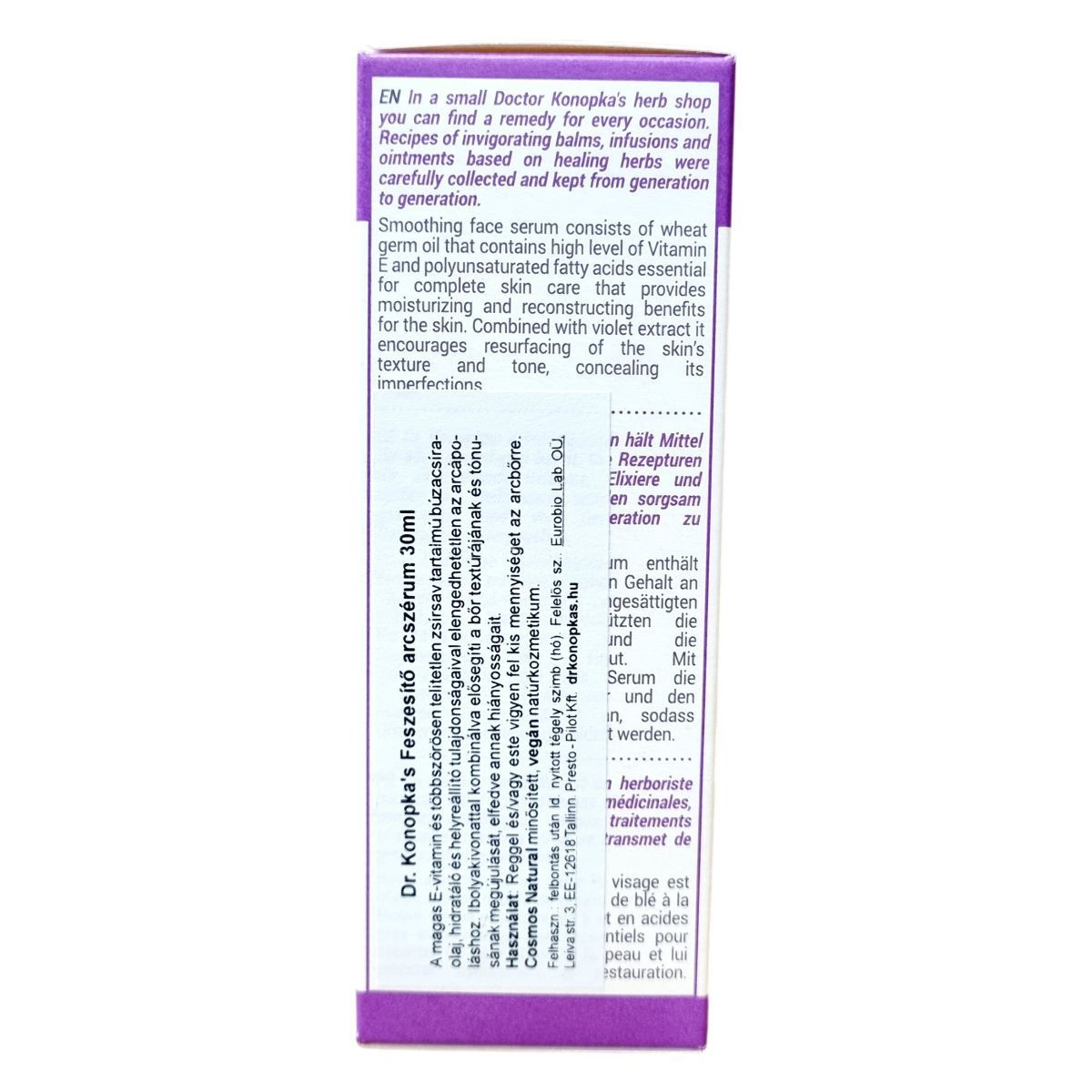 Dr. Konopka's legkisebb gyógynövényboltjában gondosan gyűjtött és generációkon át őrzött gyógyító növényeken alapuló receptek találhatók. A feszesítő arcszérumnak alapját képező búzacsíra-olaj magas E-vitamin és többszörösen telítetlen zsírsav tartalommal rendelkezik, mely elengedhetetlen a teljes körű bőrápoláshoz, hidratáló és helyreállító hatásaival segíti a bőr regenerálódását. Az organikus ibolya kivonat támogatja a bőr textúrájának megújulását és fiatalítja az arcszínt, eltüntetve a kisebb egyenetlenségeket. A termék a Cosmos Natural minősítésnek és a vegán natúrkozmetikum követelményeinek egyaránt megfelel, így a természetes és vegán életmódot követők is biztonsággal használhatják.