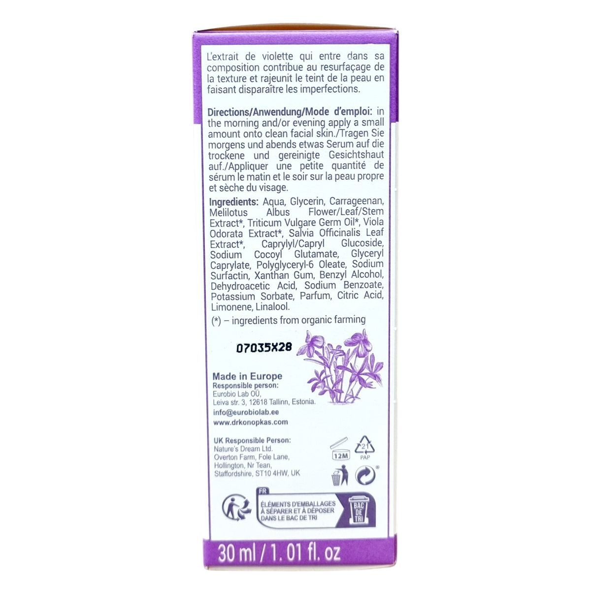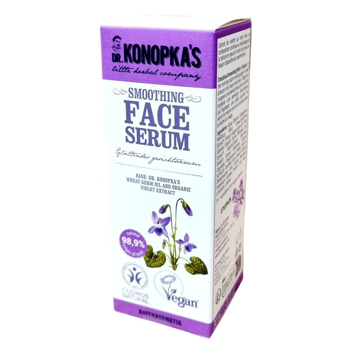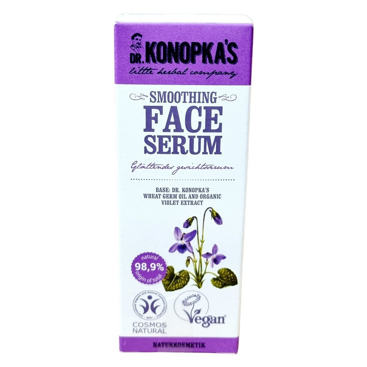 Dr. Konopka's legkisebb gyógynövényboltjában gondosan gyűjtött és generációkon át őrzött gyógyító növényeken alapuló receptek találhatók. A feszesítő arcszérumnak alapját képező búzacsíra-olaj magas E-vitamin és többszörösen telítetlen zsírsav tartalommal rendelkezik, mely elengedhetetlen a teljes körű bőrápoláshoz, hidratáló és helyreállító hatásaival segíti a bőr regenerálódását. Az organikus ibolya kivonat támogatja a bőr textúrájának megújulását és fiatalítja az arcszínt, eltüntetve a kisebb egyenetlenségeket. A termék a Cosmos Natural minősítésnek és a vegán natúrkozmetikum követelményeinek egyaránt megfelel, így a természetes és vegán életmódot követők is biztonsággal használhatják.