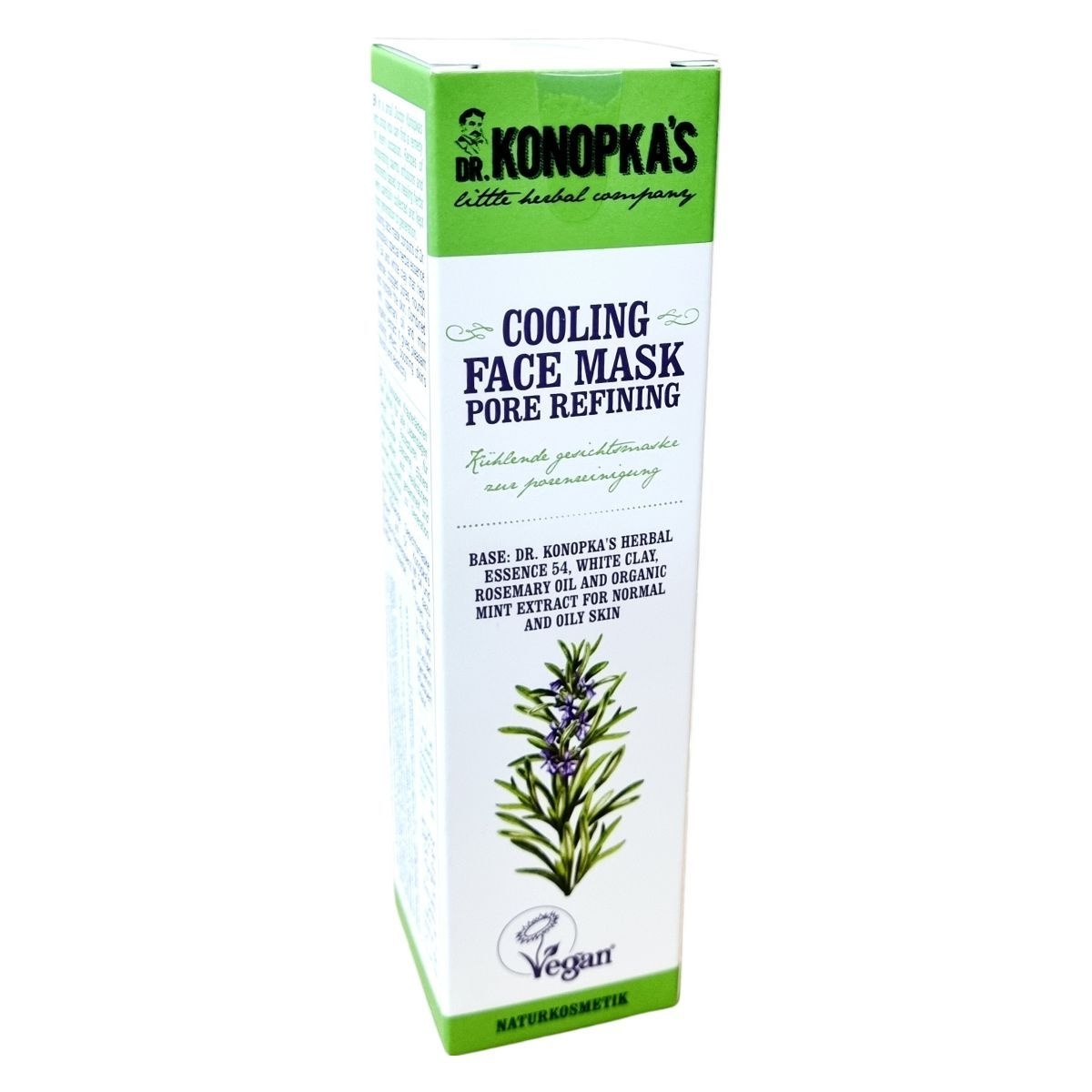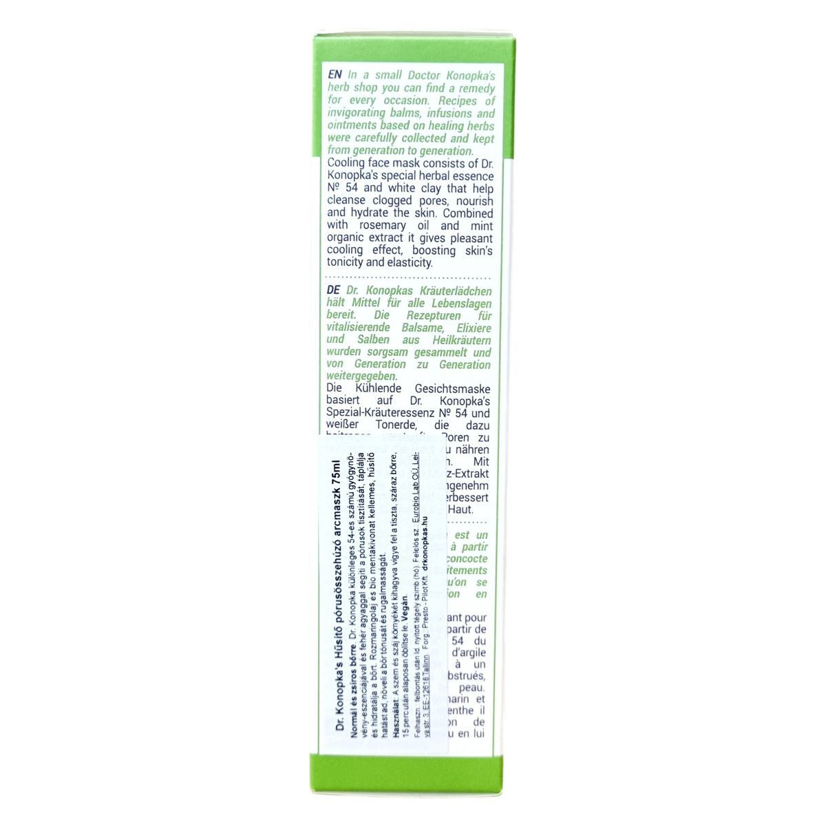 Dr. Konopka's kis gyógynövényboltjában minden alkalomra találhatunk természetes gyógymódokat. A vitalizáló balzsamok, főzetek és kenőcsök receptjeit nagy gondossággal gyűjtötték össze és generációról generációra adták tovább. A hűsítő arcmaszk Dr. Konopka speciális, 54-es számú gyógynövényes kivonatán és fehér agyagon alapul, amelyek segítik a megtisztított pórusok ápolását és a bőr hidratálását. A rozmaringolajjal és bio mentakivonattal kombinálva kellemes hűsítő érzetet nyújt, fokozva a bőr tónusát és rugalmasságát.