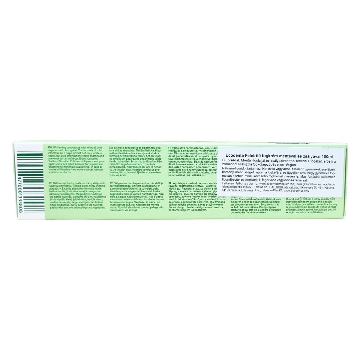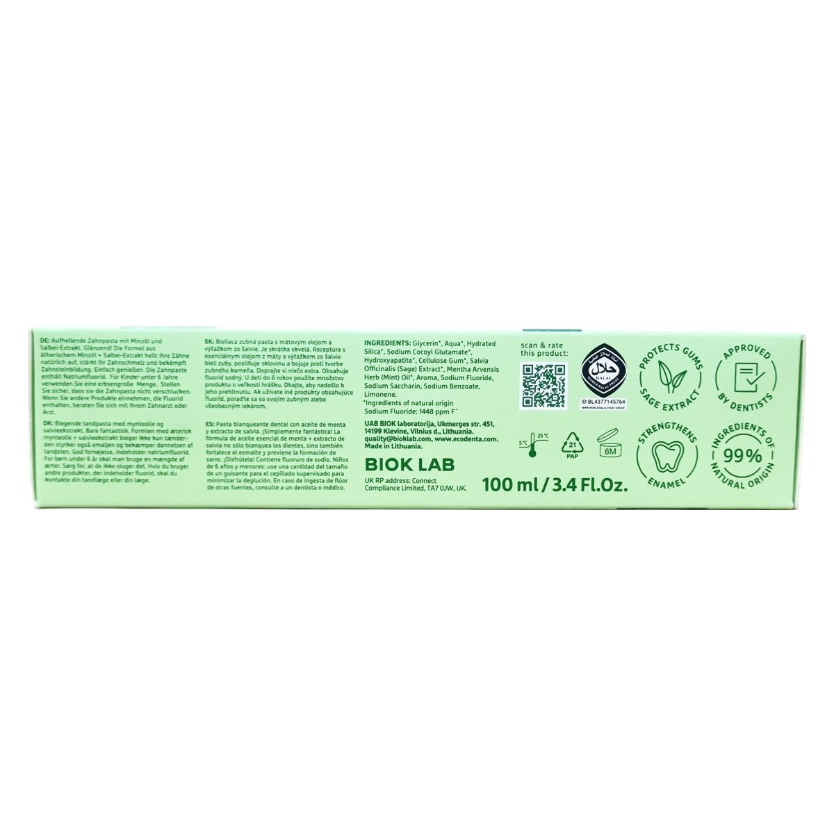 Összetevők: 99% összetevő természetes forrásból. Glycerin, Aqua, Hydrated Silica, Sodium Cocoyl Glutamate, Hydroxyapatite, Cellulose Gum, Salvia Officinalis (Sage) Extract, Mentha Arvensis Herb (Mint) Oil, Aroma, Sodium Fluoride (1448ppmF̄), Sodium Saccharin, Sodium Benzoate, Limonene.