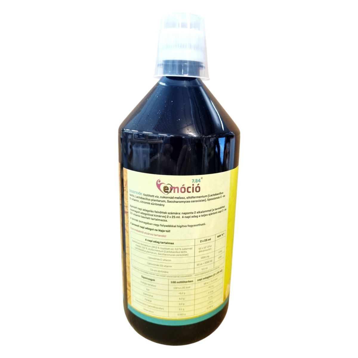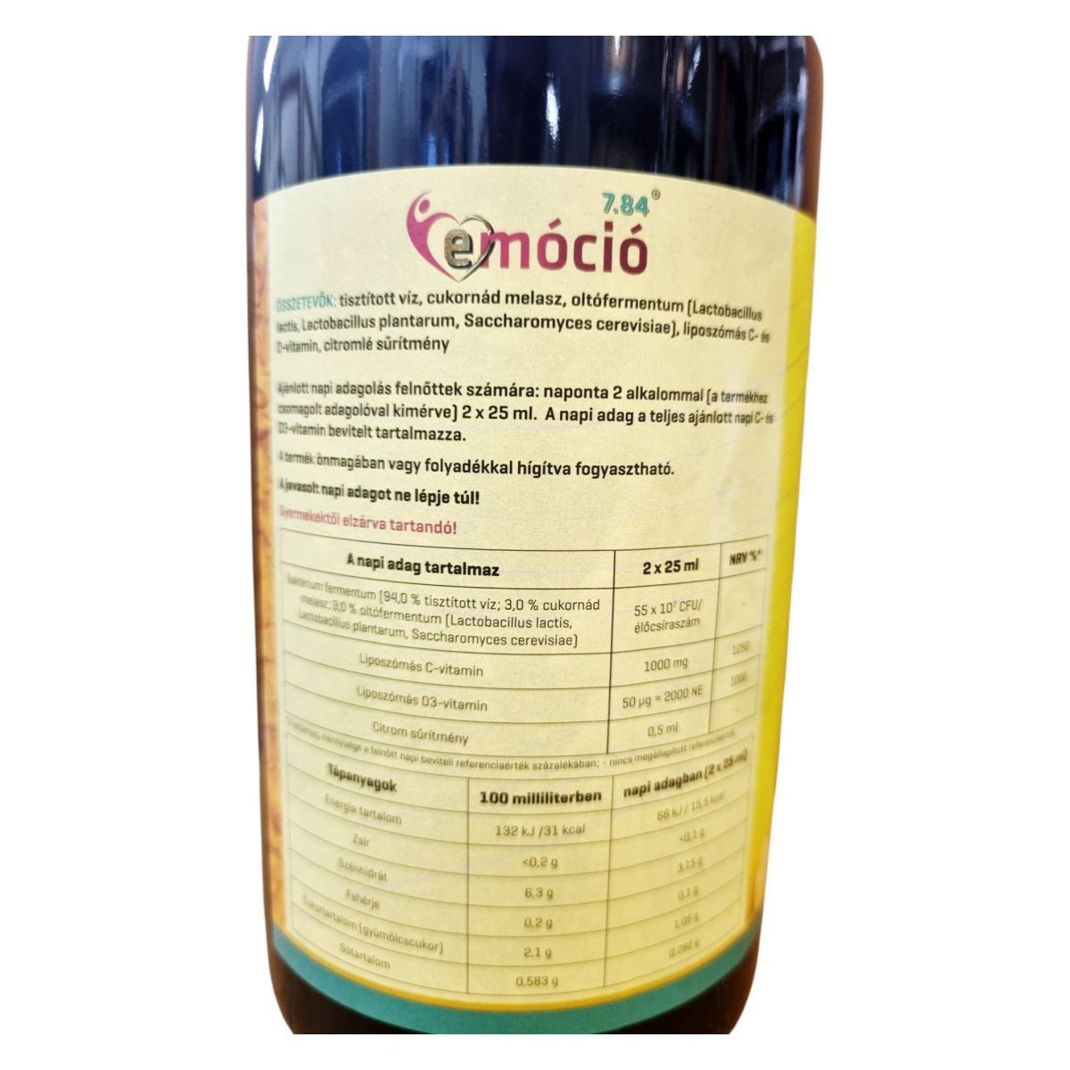 Az Emóció 7.84 egy élőflórás étrend-kiegészítő ital, amely liposzómás C- és D3-vitamint tartalmaz. Az italban található oltófermentumok, mint a Lactobacillus lactis, Lactobacillus plantarum és Saccharomyces cerevisiae, hozzájárulhatnak a bélflóra egyensúlyának fenntartásához. A termék fogyasztható önmagában vagy folyadékkal hígítva. Az esetleges üledékképződés és szálasodás természetes folyamat, amely az élőflórás mikroflóra tevékenységére utalhat. Az íz és illat változhat, ami szintén a természetes összetevők jelenlétére utalhat. A termék nem helyettesíti a kiegyensúlyozott étrendet és az egészséges életmódot.
