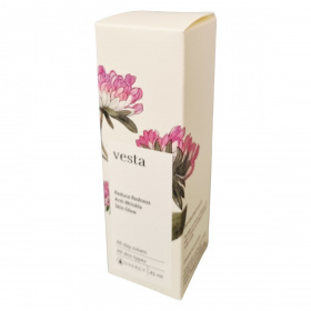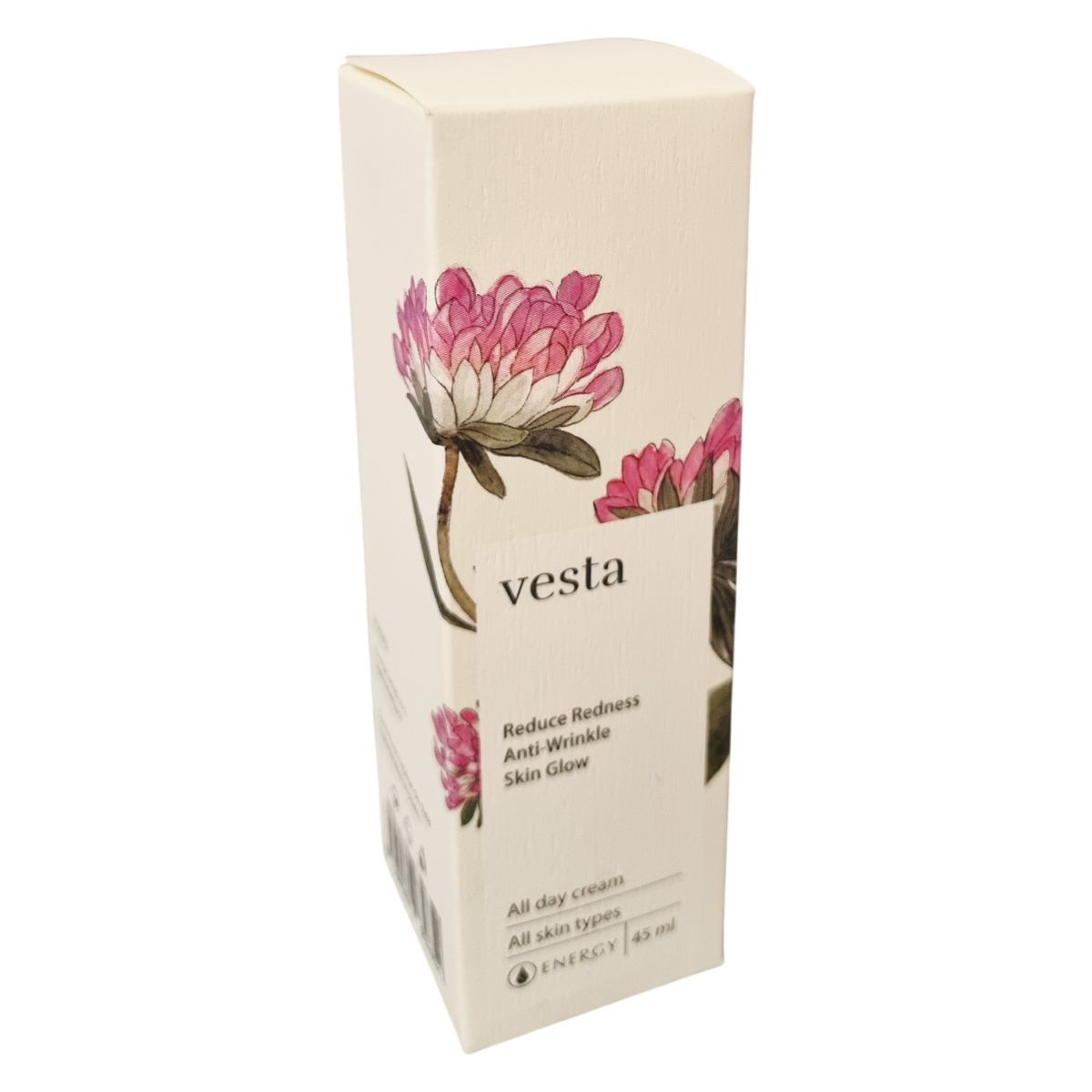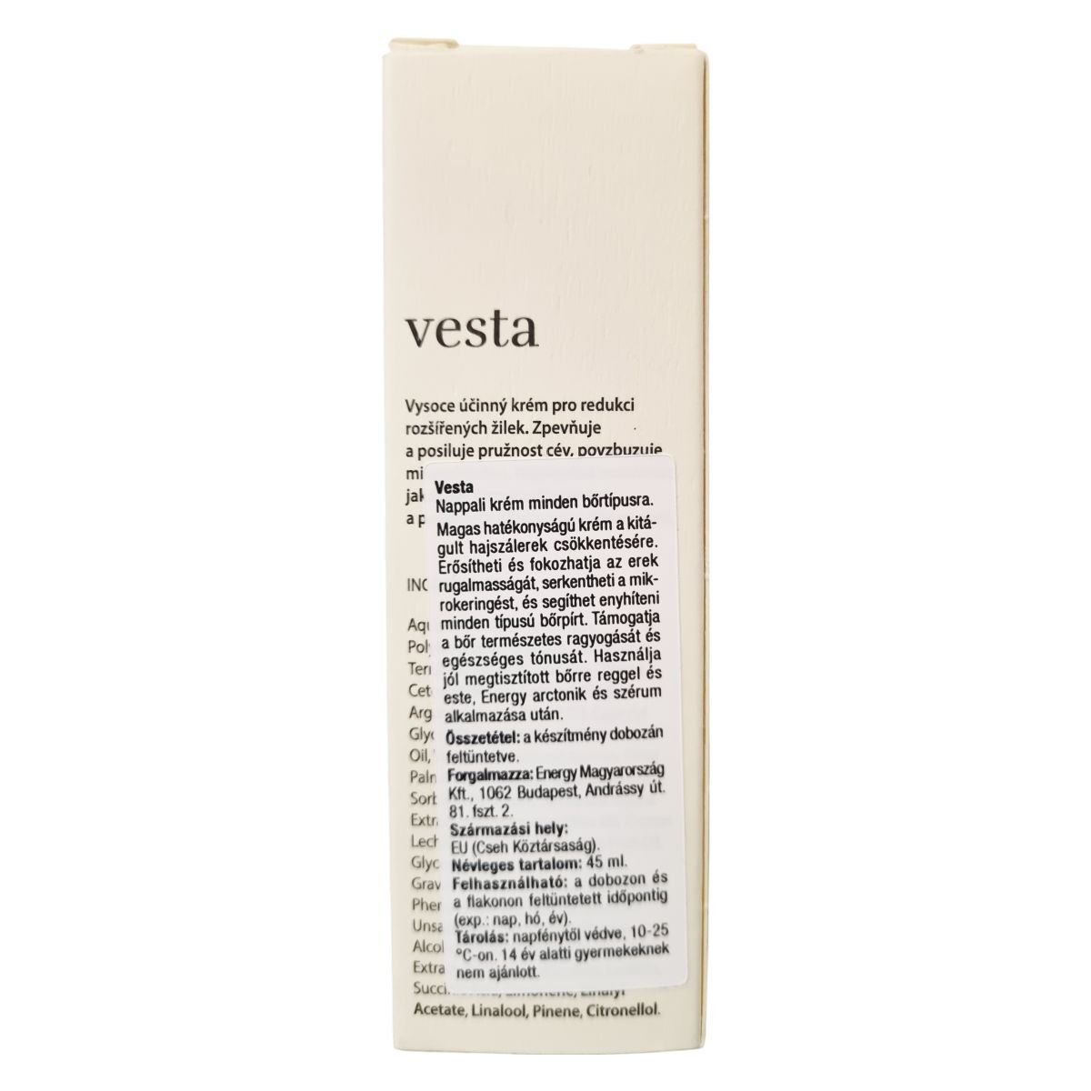 A Vesta nappali krém magas hatékonyságú arcápoló, amelyet minden bőrtípusra ajánlanak, különösen a bőrpírra és kitágult hajszálerekre hajlamos bőr ápolására. Az OCR-ben szereplő szövegek alapján erősítheti az erek rugalmasságát, serkentheti a mikrokeringést és támogatja a bőr természetes ragyogását. A krém segíthet a bőr tónusának kiegyenlítésében, enyhítheti a kipirosodást, és hozzájárulhat az üde, egészséges megjelenéshez. Mindennapi használatra készült, reggel és este alkalmazható arctonik és szérum után. A termék 45 ml-es kiszerelésben érhető el, tárolására száraz, hűvös, napfénytől védett hely ajánlott. A gyártó a Cseh Köztársaságban működő Energy Group a. s.