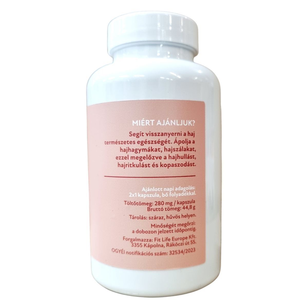 A hajkapszula 280 mg töltőtömegű kapszulában készül, a kapszulahéj hidroxi-propil-metil-cellulózból áll, amely tisztított vizet is tartalmaz 4–6% arányban. A termék kizárólag növényi összetevőket tartalmaz, és nem tartalmaz tartósítószert. A csomagolás 60 kapszulát foglal magában, bruttó tömege 44,8 gramm. A termék forgalmazója a Fit Life Europe Kft., székhelye: 3355 Kápolna, Rákóczi út 55.