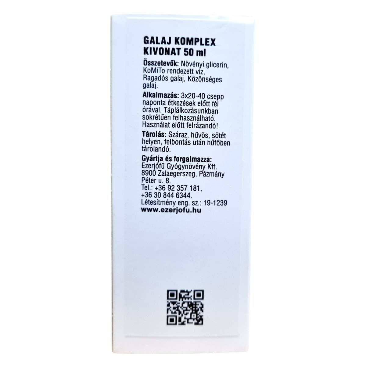 Az EzerJóFű Galaj komplex kivonat egy alkoholmentes készítmény, amely ragadós és közönséges galajt tartalmaz. A termék sokrétűen felhasználható a táplálkozásban, és természetes összetevőivel támogathatja az egészséges életmódot. A kivonatot naponta háromszor, étkezések előtt fél órával ajánlott fogyasztani. A termék tárolása száraz, hűvös, sötét helyen javasolt, felbontás után pedig hűtőben. Az Ezerjófű Gyógynövény Kft. által gyártott és forgalmazott termék engedélyszáma 19-1239.