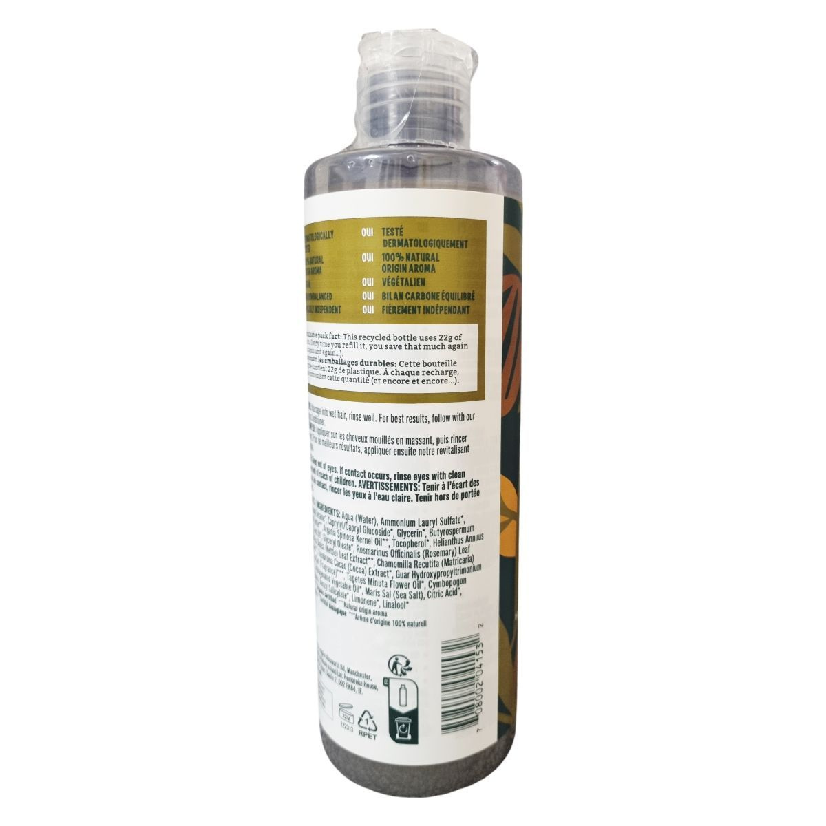Víz (Aqua), ammónium-lauril-szulfát, kókuszolaj eredetű felületaktív anyag (Cocamidopropyl Betaine), cukor alapú tisztító összetevő (Caprylyl/Capryl Glucoside), glicerin, shea vaj (Butyrospermum Parkii Butter), argánolaj (Argania Spinosa Kernel Oil), E-vitamin (Tocopherol), napraforgómag-olaj (Helianthus Annuus Seed Oil), glicerin-oleát, rozmaring levél kivonat (Rosmarinus Officinalis Leaf Extract), csalánlevél kivonat (Urtica Dioica Leaf Extract), kamillavirág kivonat (Chamomilla Recutita Flower Extract), kakaó kivonat (Theobroma Cacao Extract), guárgumi származék (Guar Hydroxypropyltrimonium Chloride), illatanyag (Parfum), tagetes virágolaj (Tagetes Minuta Flower Oil), pálmarózsa olaj (Cymbopogon Martini Oil), hidrogénezett növényi olaj, tengeri só (Maris Sal), citromsav (Citric Acid), nátrium-benzoát, benzil-szalicilát, limonén, linalool
