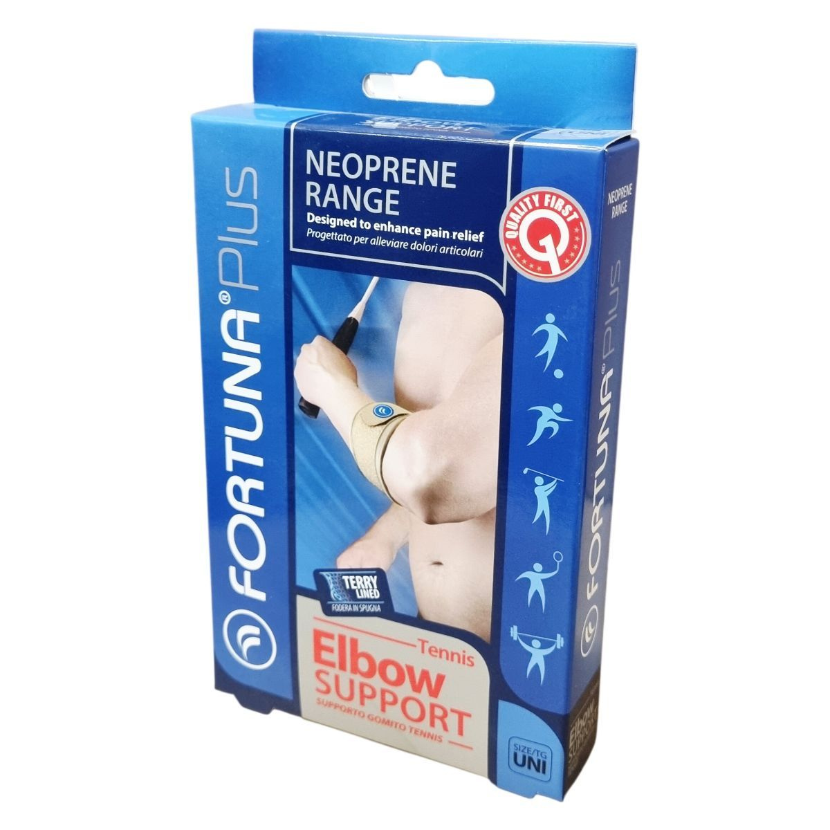 A Fortuna International neoprén támaszok kiváló minőségű neoprén gumiból készülnek, amelyek állandó, egyenletes kompressziót és támogatást nyújtanak. A belső frottír bélés csökkenti az izzadtság felgyülemlését és növeli a komfortérzetet. A támasz megtartja a test melegét, ami serkenti a vérkeringést a sérült területen, elősegítve a természetes gyógyulást és kényelmet biztosít. A meleg hatás javítja az izmok és ízületek rugalmasságát, segítve a sportbalesetek megelőzését. A termék kézzel mosható langyos, szappanos vízben, majd levegőn szárítandó. A termék univerzális méretű, bármelyik könyök középső részén legfeljebb 37,5 cm-es körfogatig használható.