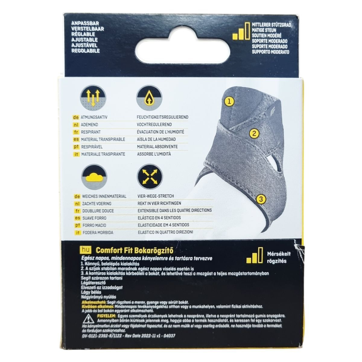A FUTURO™ Comfort Fit bokarögzítő állítható, közepes támaszt nyújtó kialakítású, könnyű, belépős és elasztikus, négyirányú nyúlású anyagból készülő termék. Kontúros, körbeölelő formája lehetővé teszi a teljes mozgástartományt, miközben stabil tartást biztosít. Légáteresztő és nedvesség-szabályozó tulajdonságai révén segít szárazon tartani a bőrt, lágy belső anyaga kényelmes viseletet garantál napi használatra. Használat előtt és alatt kézi mosással tisztítható 30 fokon, nem szabad fehéríteni, vasalni vagy vegytisztítani. A termék jobb- és balbokán egyaránt használható, és alkalmas mindennapos otthoni, munkahelyi, valamint fizikai tevékenységekhez. Használat közben megjelenő bőrprobléma vagy fájdalom esetén azonnal hagyja abba a használatát és konzultáljon orvosával.
