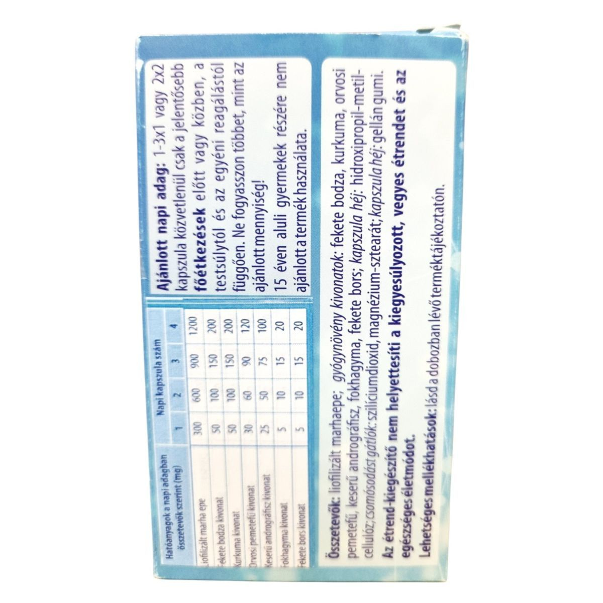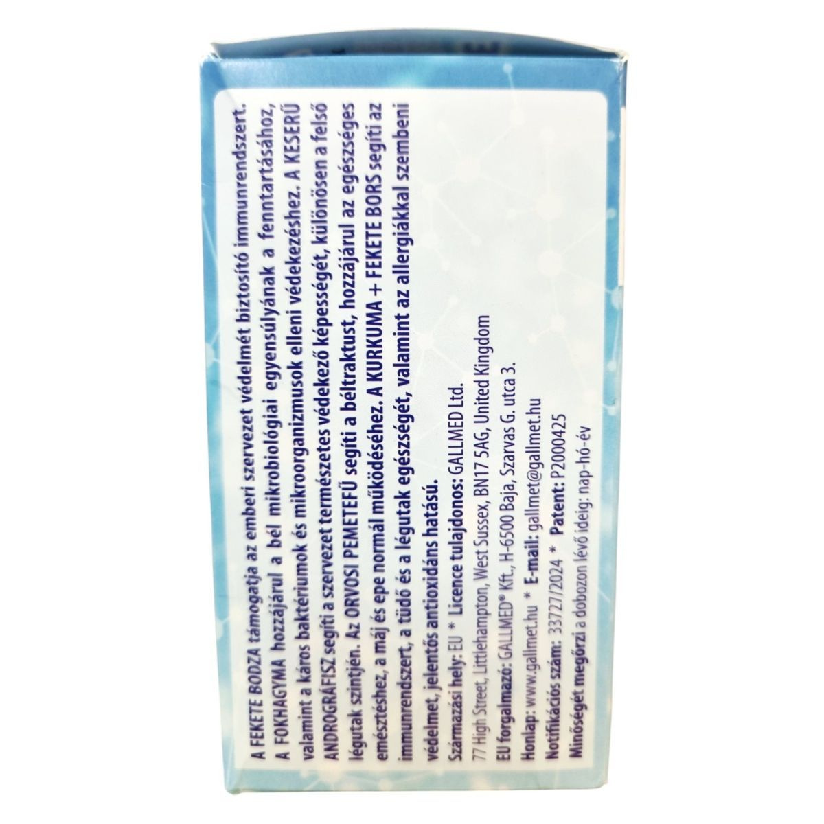 A GALLMET IMMUNE (ANTIBAC) étrendkészítő kapszula természetes összetevőkkel készült, és célja, hogy támogassa az immunrendszert és az emésztést, valamint hozzájáruljon a káros baktériumok és mikroorganizmusok elleni védelemhez. A készítmény fekete bodza, kurkuma, orvosi pemetefű, keserű andrografisz, fokhagyma és fekete bors kivonatokat tartalmaz. A fekete bodza támogathatja az immunrendszert, a fokhagyma hozzájárulhat a bél mikrobiológiai egyensúlyának fenntartásához, míg a keserű andrografisz segítheti a szervezet természetes védekező képességét. Az orvosi pemetefű segítheti a béltraktust, a kurkuma és fekete bors kombinációja pedig antioxidáns hatású lehet. A termék használata előtt ajánlott szakemberrel konzultálni, különösen, ha más epére ható készítményeket is szed. A készítmény nem helyettesíti a kiegyensúlyozott, vegyes étrendet és az egészséges életmódot.