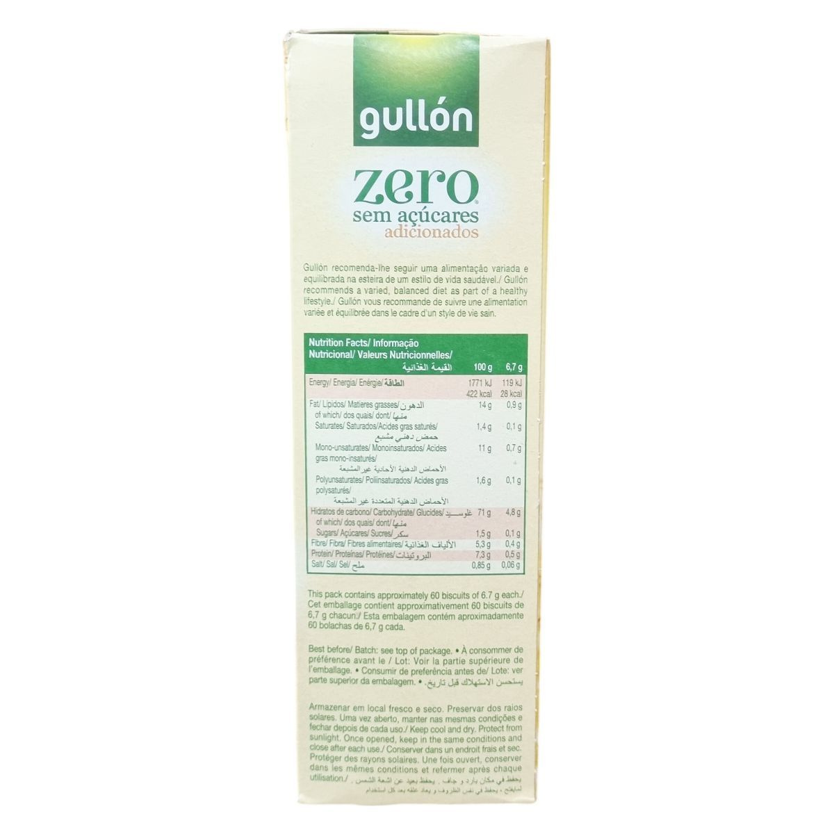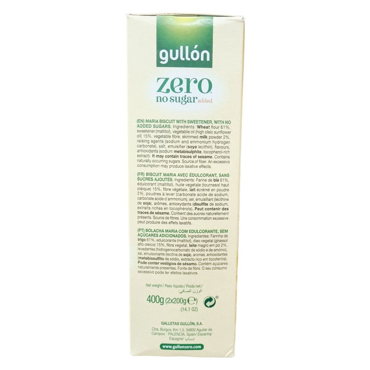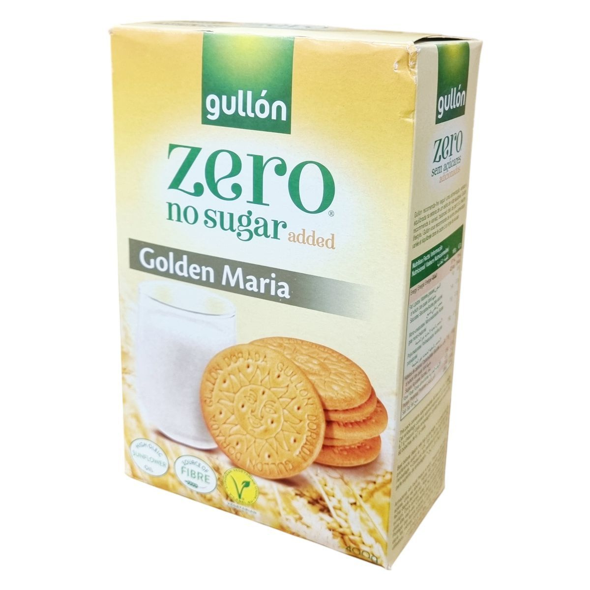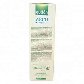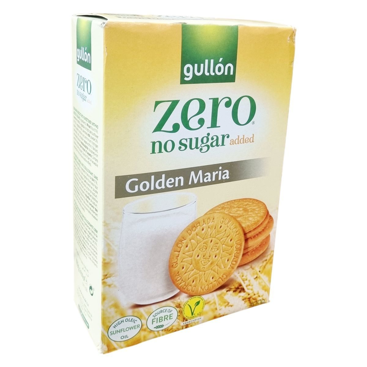 A Gullón Golden Maria Zero keksz egy alacsony hozzáadott cukortartalmú finomság, amely maltitollal édesített. A termék összetevői között a búzaliszt, magas olajsavtartalmú napraforgóolaj, növényi rost és sovány tejpor találhatók, emellett térfogatnövelő és antioxidáns anyagokat is tartalmaz. Kíváló rostforrás, és a vegetáriánus étrendet követők számára is alkalmas. A csomag körülbelül 60 darab, egyenként 6,7 grammos kekszet tartalmaz. Az élelmiszeripari előírásoknak megfelelően tartalmazhat természetes cukrokat és nyomokban szezámmagot. Ajánlott változatos étrend részeként, mértékkel fogyasztani, mivel túlzott bevitele hashajtó hatású lehet. A termék spanyolországi gyártásból származik, és gondosan tárolva, napfénytől védve hosszabb ideig megőrzi minőségét.
