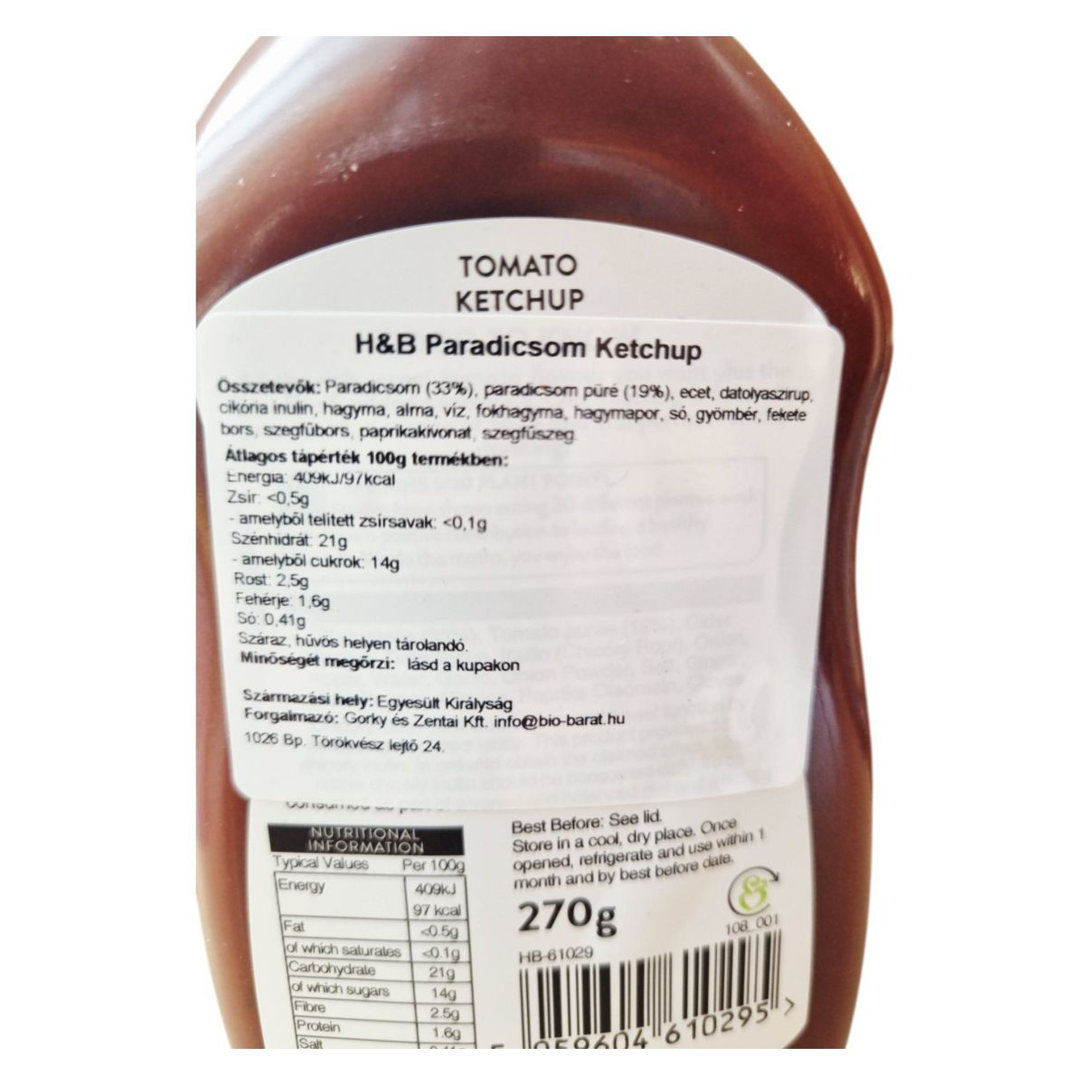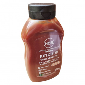 A H&B Paradicsom Ketchup egy különleges, prebiotikus ketchup, amelyet Dr. Will's közreműködésével fejlesztettek ki. A termék gazdag és édes paradicsom ízével, valamint prebiotikus összetevőivel, mint a cikória inulin, hozzájárulhat az egészséges táplálkozáshoz. A ketchup bio és növényi alapú, így ideális választás lehet azok számára, akik gluténmentes étrendet követnek. A termék az Egyesült Királyságból származik, és a Gorky és Zentai Kft. forgalmazza Magyarországon.