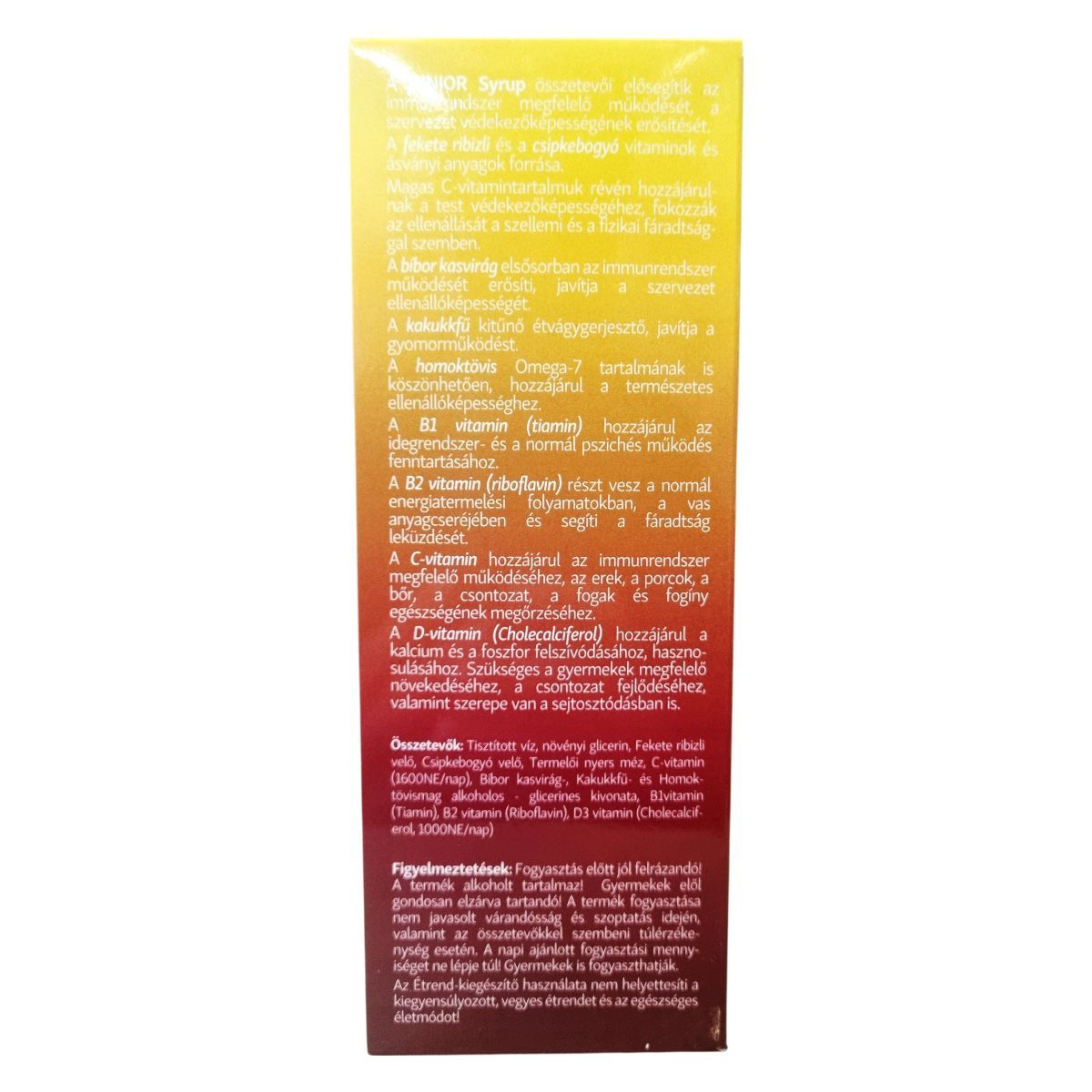 A HerbaClass Junior Syrup olyan összetevőket tartalmaz, amelyek segítik az immunrendszer megfelelő működését és erősítik a szervezet védekezőképességét. A fekete ribizli és a csipkebogyó gazdag vitamin- és ásványianyag-források, különösen magas C-vitamin tartalmuk támogatja a test ellenálló képességét, és segít leküzdeni a fizikai és szellemi fáradtságot. A bíbor kasvirág az immunrendszer erősítésében játszik fontos szerepet, míg a kakukkfű javítja az étvágyat és a gyomorműködést. A homoktövis Omega-7 tartalma szintén hozzájárul a természetes ellenállóképesség fenntartásához. A B1-vitamin támogatja az idegrendszer és a pszichés működés egészségét, a B2-vitamin részt vesz az energiatermelő folyamatokban és segíti a fáradtság csökkentését. A D3-vitamin fontos a kalcium- és foszforfelszívódásban, szükséges a gyermekek csontozatának fejlődéséhez és a sejtosztódáshoz. A szirup alkoholtartalma kevesebb, mint 1,2 tömeg%. Tartósítószert nem tartalmaz, 100%-os gyümölcsvelőkkel és termelői nyers mézzel készül, növényi alapú glicerin hozzáadásával.
