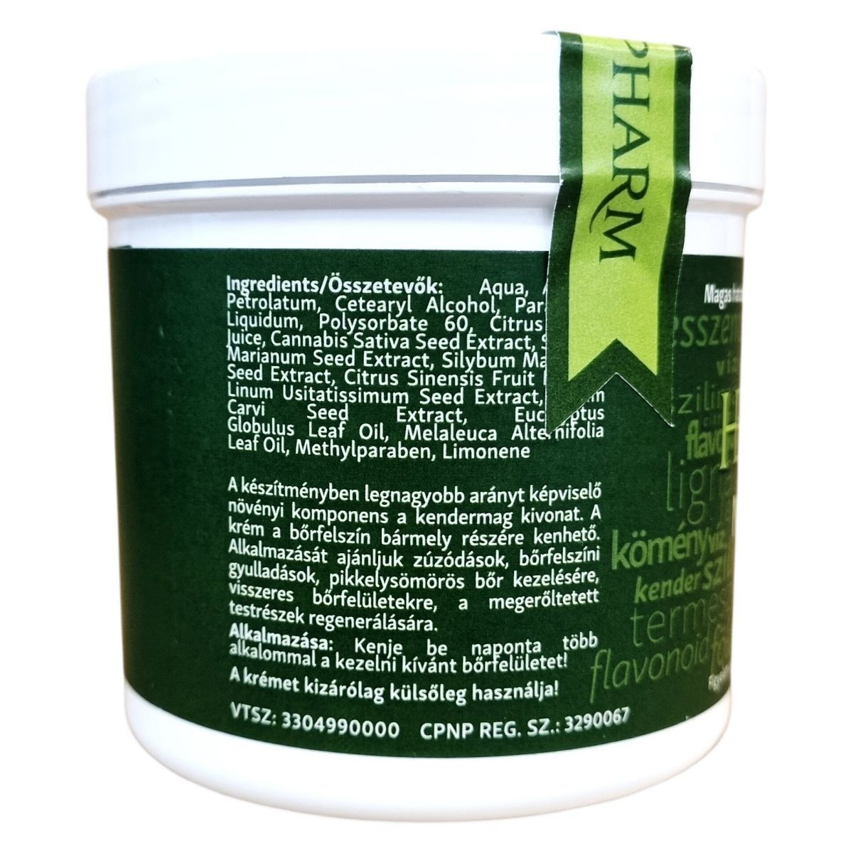 A krém legfőbb növényi összetevője a kendermag kivonat, amely hatékonyan támogatja a bőr gyógyulását és regenerációját. Különösen ajánlott zúzódások, bőrfelszíni gyulladások, pikkelysömörös bőr, visszeres területek kezelésére, valamint megerőltetett testrészek ápolására. A készítmény több bioaktív növényi kivonatot tartalmaz, így komplex módon járul hozzá a bőr állapotának javításához. A krém 300 ml-es kiszerelésben érhető el.
