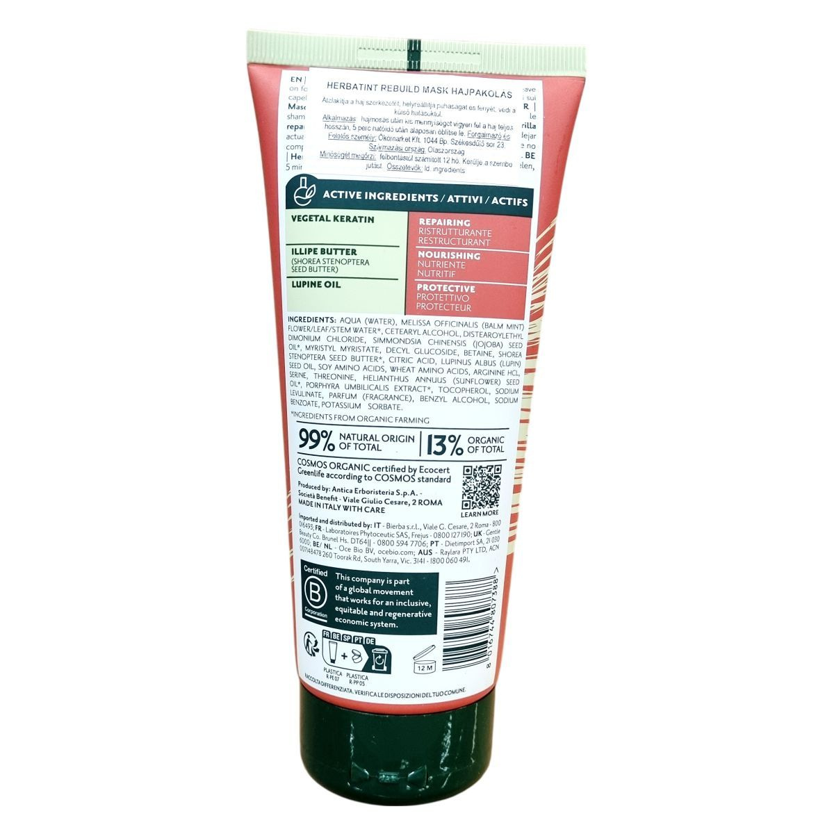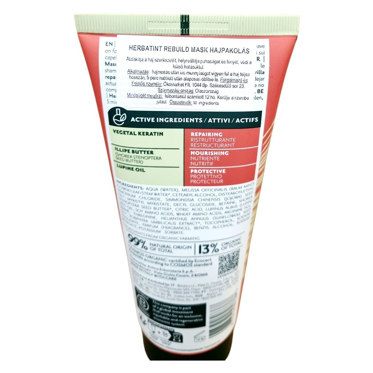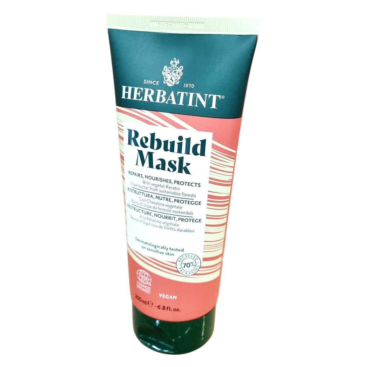 A Herbatint Rebuild Mask egy természetes eredetű összetevőket tartalmazó hajápoló termék, mely 99%-ban természetes alapanyagokból készült, ebből 13% organikus forrásból származik. A pakolás növényi keratinnal, illipe vajjal és lupin olajjal táplálja, helyreállítja és védi a hajat a külső hatásokkal szemben. A termék csomagolása 70%-ban újrahasznosított anyagból készült, környezetbarát és vegán formula, amely alkalmas érzékeny bőrön történő használatra is. A készítményt Olaszországban gyártják nagy gonddal, és bőrgyógyászatilag tesztelték. Használata egyszerű, a hajmosást követően kell alkalmazni, majd 5 perc után alaposan ki kell öblíteni.