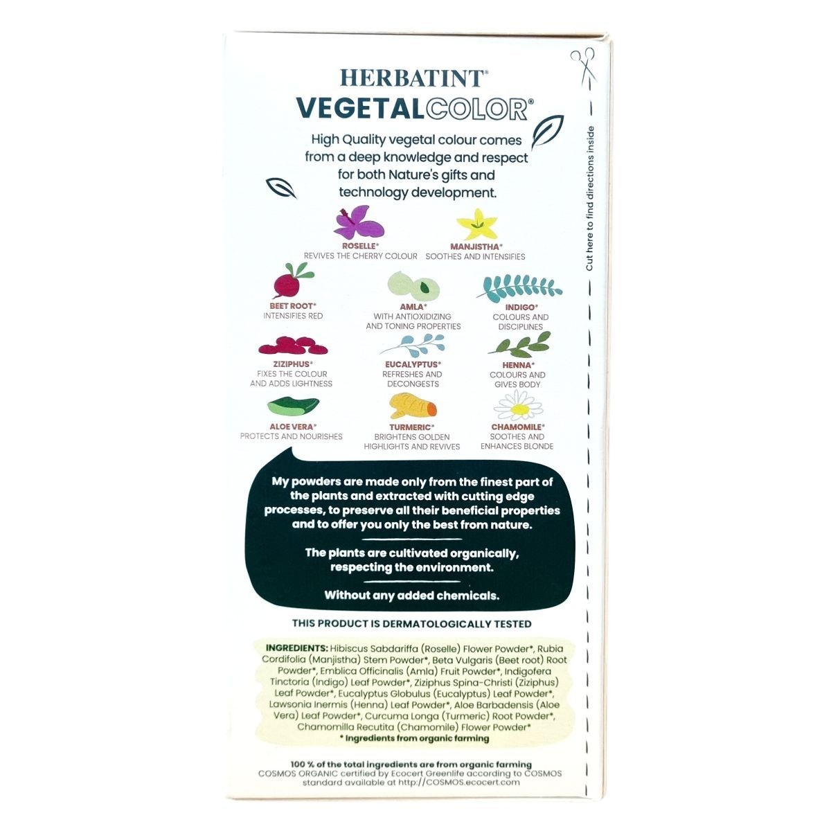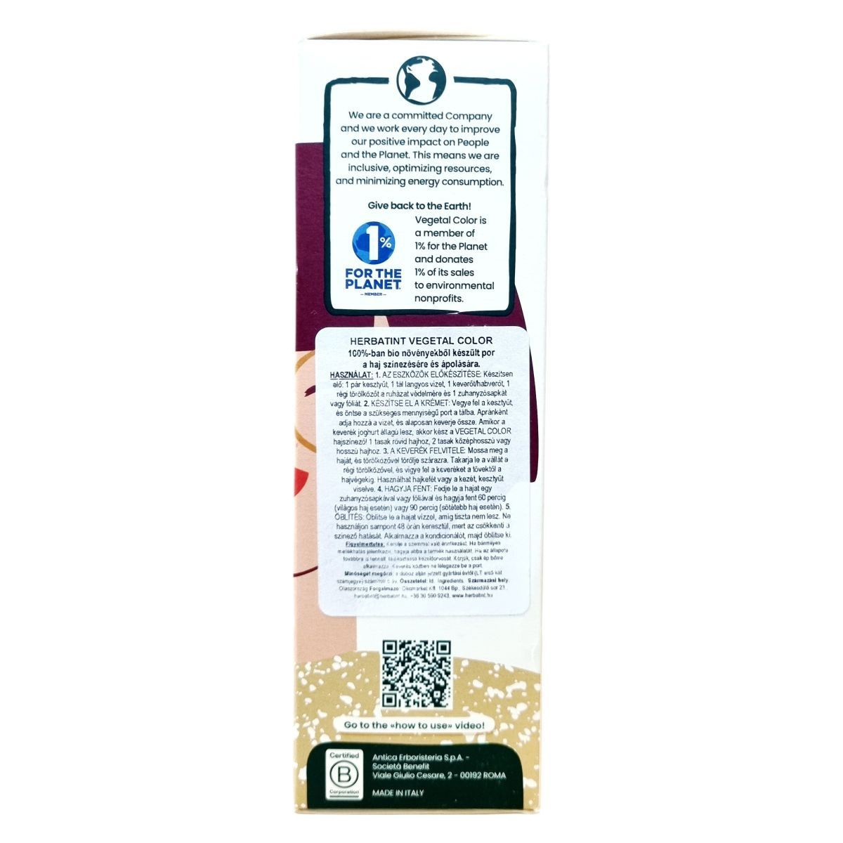 A Herbatint Vegetal Color egy 100% bio növényi alapú hajfesték és ápoló por, amely ayurvédikus növénykivonatokból és organikus összetevőkből áll. Színező hatását különleges növények, mint a roselle, manjistha és cékla erősítik, miközben összetevői kíméletesek a hajhoz és a fejbőrhöz, vegán és dermatológiailag tesztelt. A termék környezetbarát, csatlakozott a 1% for the Planet kezdeményezéshez, és elkötelezett a fenntartható gyártás mellett. Használatával a haj természetes szépsége és egészsége megőrizhető, miközben színében is intenzív, tartós megjelenést kap. A csomagolás környezetbarát anyagokból készült, és nem tartalmaz fölösleges eldobható eszközöket, támogatva a fenntartható életmódot.
