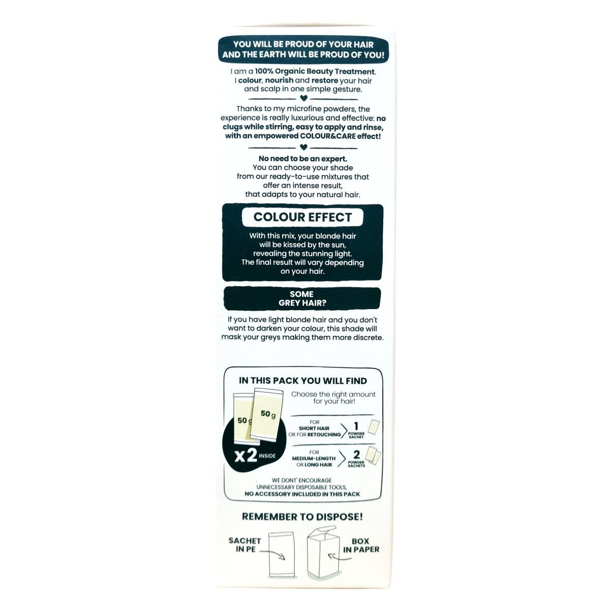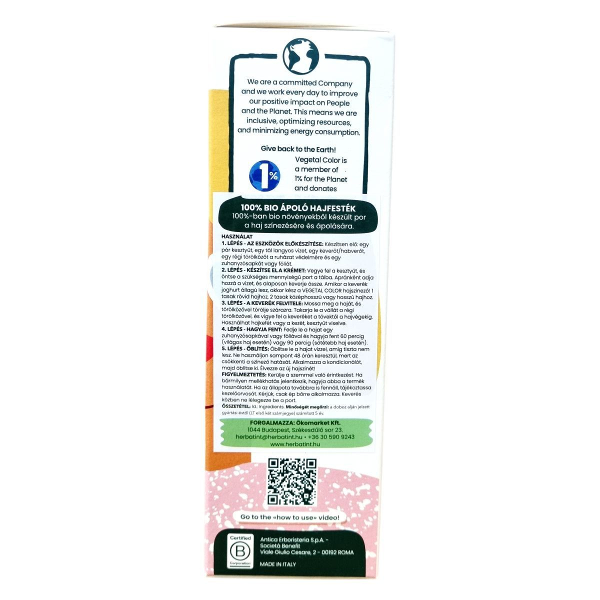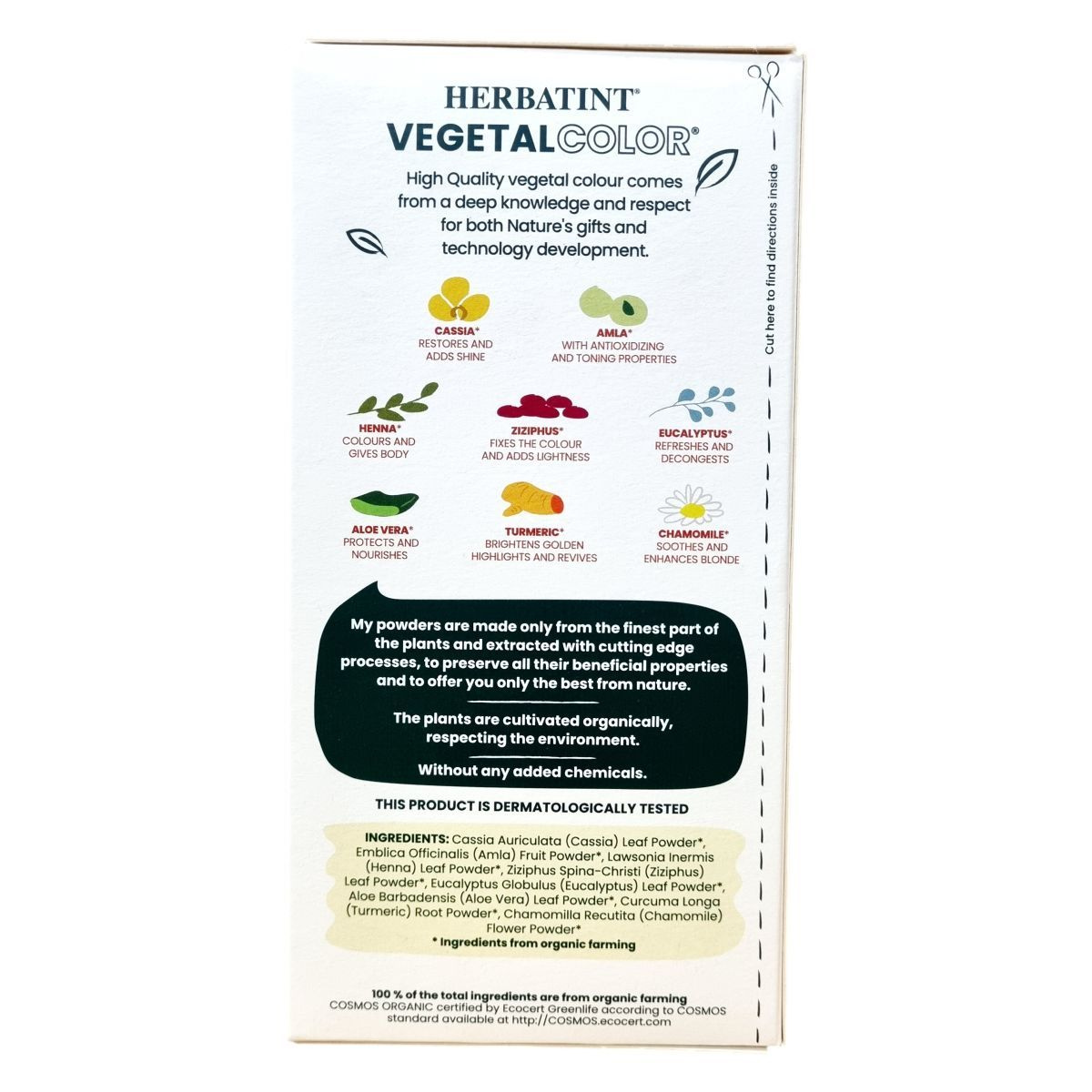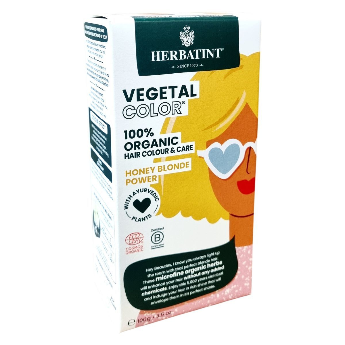 A Herbatint Vegetal Color hajszínező por a természet és a fejlett technológia tiszteletén alapul. 100%-ban organikus, finom porrá őrölt növényi részekből készül, melyek megőrzik jótékony hatásukat. A termék ápolja, táplálja és színezi a hajat vegyi anyagok hozzáadása nélkül, így egy luxus élményt kínál, könnyen alkalmazható és öblíthető. A szín élénk és igazodik a természetes hajszínhez, a világos haj napsütötte ragyogását hozza elő, a szürkét enyhén elfedi anélkül, hogy sötétítené a hajat. A csomagban 1 vagy 2 tasak található a hajhossz függvényében, környezettudatos csomagolásban. A termék a bolygó és az emberek iránti elkötelezettséggel készült, és a gyártó a fenntarthatóság elveit követve csökkenti energiafelhasználását és optimalizálja az erőforrásokat.