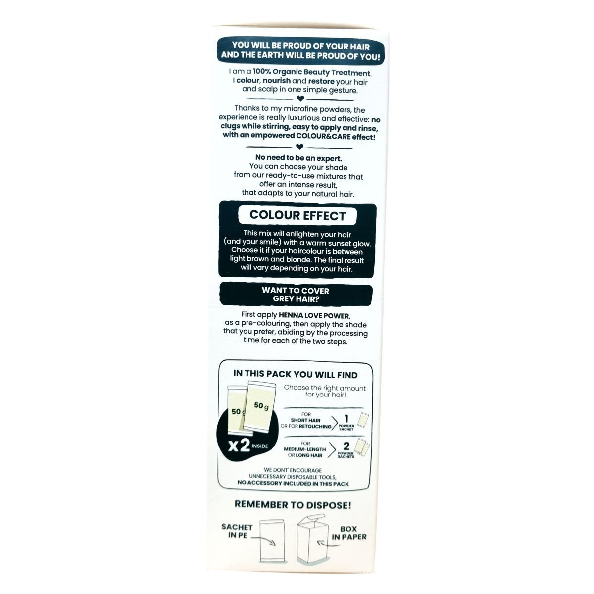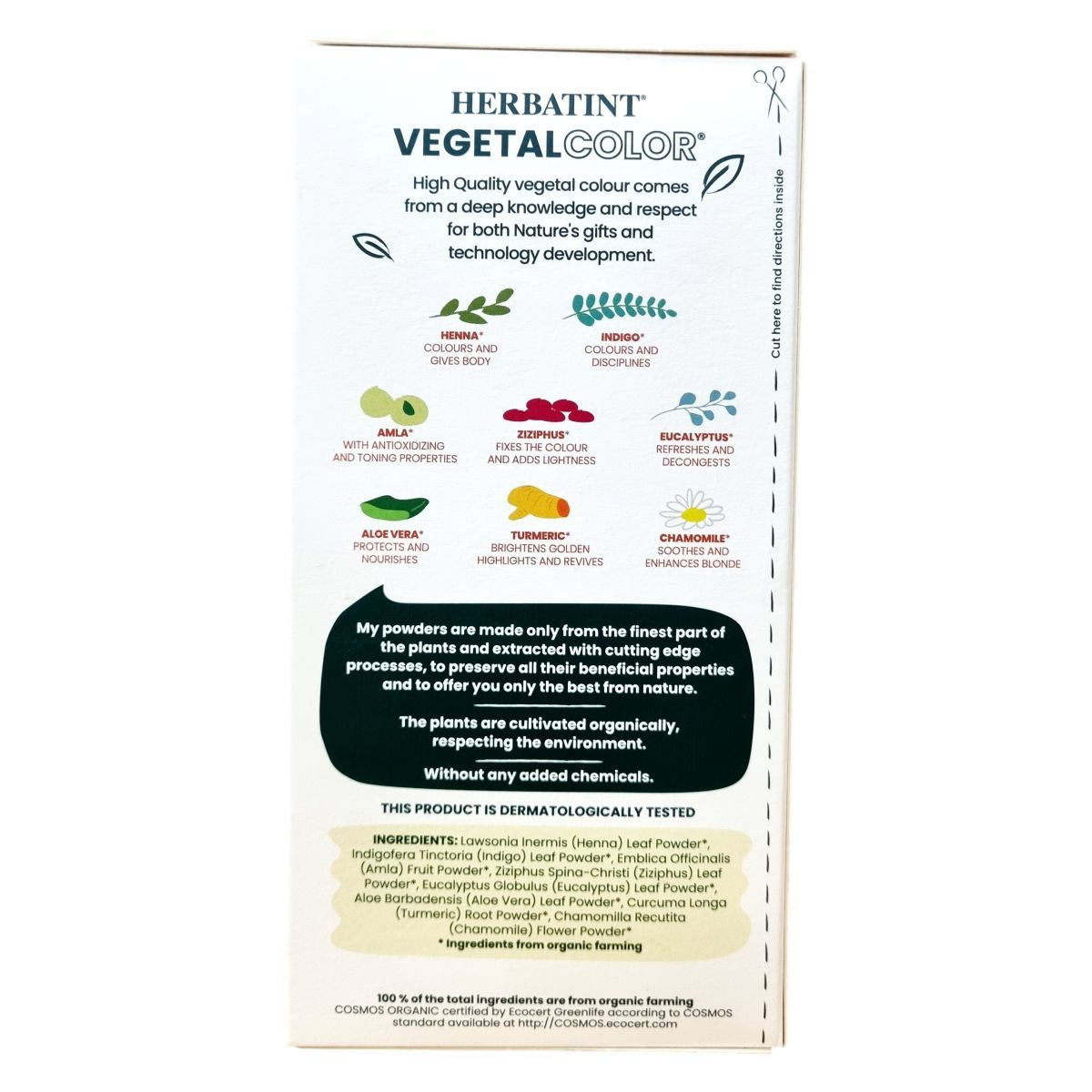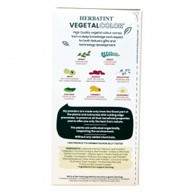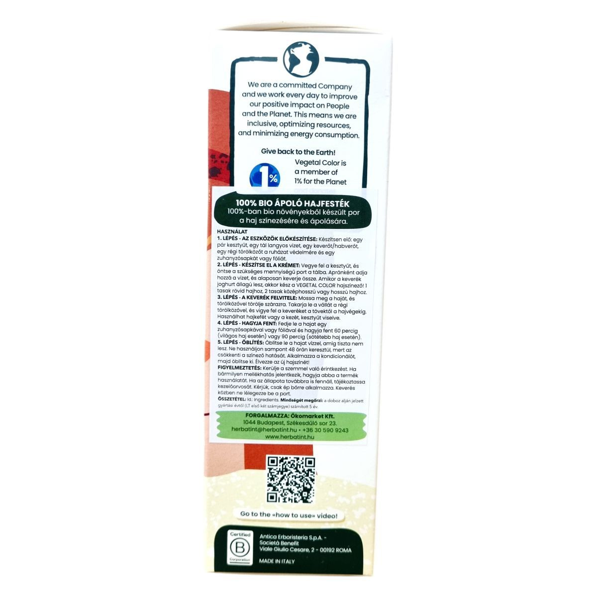 A Herbatint Vegetal Color egy magas minőségű, 100%-ban organikus hajfesték és ápoló por, amely a természet és a technológia fejlődésének tiszteletén alapul. A termék kizárólag bio növényi részekből készül, modern eljárásokkal kinyerve a növények jótékony hatóanyagait. Az ayurvédikus növények támogatják a haj színezését, ápolását és természetes regenerálását. A használat során nincs szükség vegyi anyagokra, ami kíméli a fejbőrt és a haj szerkezetét. A csomagolás környezettudatos, a tasak PE-ből, a doboz papírból készült, és a termék része a 1% for the Planet kezdeményezésnek. Használható szürke haj fedésére is, ebben az esetben először Henna Love Power-t ajánlott alkalmazni előszínezésként, majd a választott árnyalatot. Kiváló választás azoknak, akik egy egyszerű, mégis hatékony és környezetbarát hajfestési megoldást keresnek.
