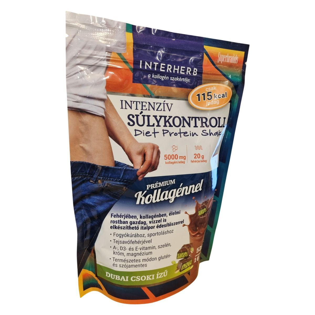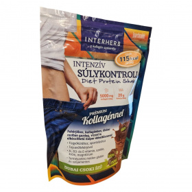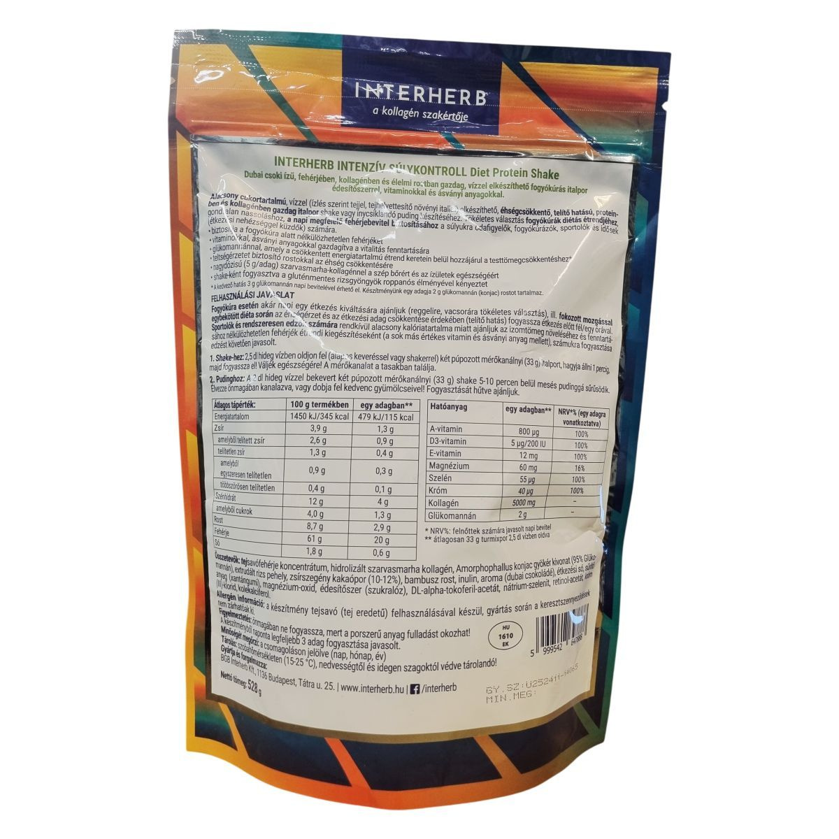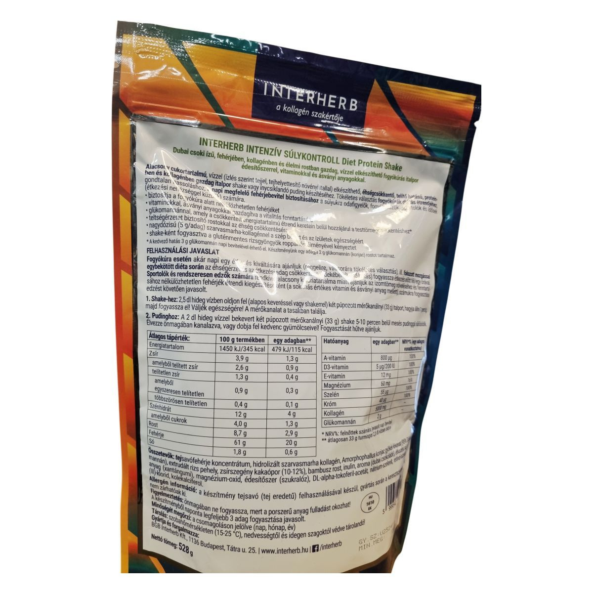 Az INTERHERB INTENZÍV SÚLYKONTROLL Diet Protein Shake egy dubai csoki ízű italpor, amely vízzel vagy ízlés szerint tejjel, tejhelyettesítő növényi itallal készíthető el. Alacsony cukortartalmának és magas fehérjetartalmának köszönhetően támogatni tudja a fogyókúrát és a súlykontrollt, valamint segítheti az éhségérzet csökkentését a telítő hatású rostjai által. A készítmény tartalmaz tejsavófehérjét és hidrolizált szarvasmarha kollagént, valamint A-, D3- és E-vitamint, szelént, krómot és magnéziumot a vitalitás fenntartásához. Glükomannán tartalma (2 g/adag) hozzájárulhat a testtömeg csökkentéséhez egy csökkentett energiatartalmú étrend keretein belül, különösen, ha napi bevitele eléri a 3 g-ot. A termék glutén- és szójamentes, a gluténmentes rizsgyöngyök roppanós élményt adnak fogyasztáskor. Két elkészítési módja lehetséges: shake-ként vagy pudingként, utóbbi 5-10 perc alatt sűrűsödik be, és hűtve ajánlott fogyasztani. Az alacsony kalóriatartalom miatt különösen ajánlott sportolók és fogyókúrázók számára, illetve időseknek, akik étkezési nehézségekkel küzdenek. A termék nem fogyasztható önmagában a fulladásveszély miatt, naponta legfeljebb 3 adag ajánlott.