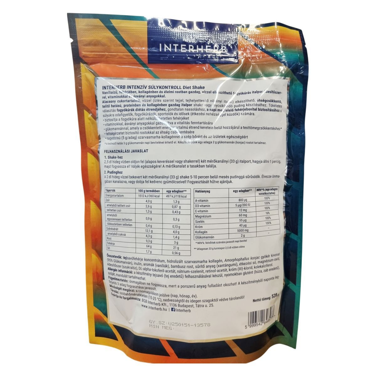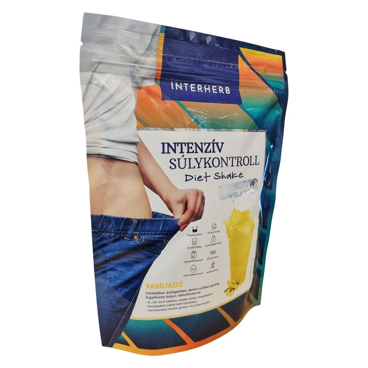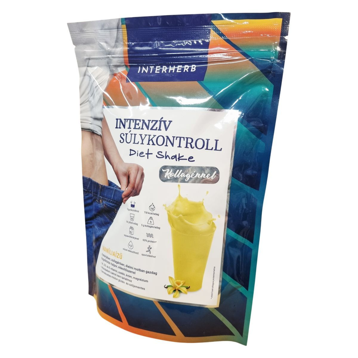 Az Interherb Intenzív Súlykontroll Diet Shake egy alacsony kalóriatartalmú, vaníliaízű fogyókúrás italpor, amely tejsavófehérje koncentrátummal és hidrolizált szarvasmarha kollagénnel készül. A termék 60% fehérjetartalommal bír, és magas rosttartalma miatt teltségérzetet biztosíthat. Glükomannán rostot tartalmaz, amely a csökkentett energia-tartalmú étrend mellett hozzájárulhat a testtömeg csökkentéséhez. A készítmény A-, D3- és E-vitaminokat, valamint szelént, krómt és magnéziumot tartalmaz, melyek támogatják a vitalitás fenntartását. Édesítőszerrel készül, hozzáadott cukrot nem tartalmaz, valamint természetes módon glutén- és szója mentes. A termék alkalmas fogyókúrázók, sportolók és idősek számára, akik a napi megfelelő fehérjebevitelre és teljes értékű táplálkozásra törekednek. Shake- vagy pudingformában fogyasztható, a puding 5-10 perc alatt sűrűsödik be. A termék tejfehérjét tartalmaz, ezért allergiások számára a fogyasztása figyelmet igényel. Naponta legfeljebb 3 adag fogyasztása ajánlott a biztonságos használat érdekében.