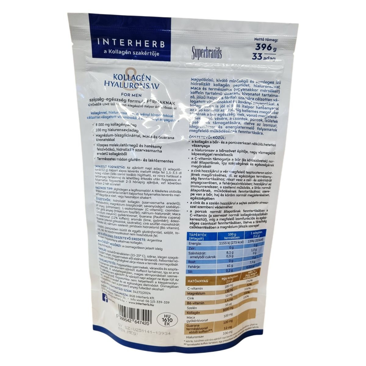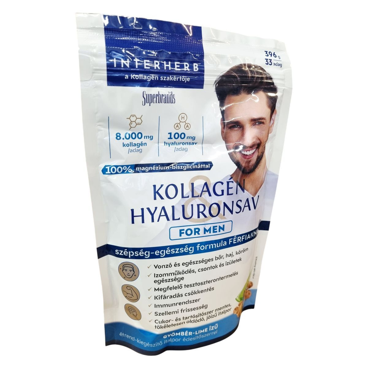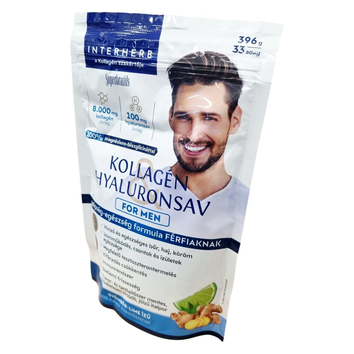 Interherb Kollagén&Hyaluronsav for men szépség-egészség formula férfiaknak gyömbér-lime ízű étrend-kiegészítő italpor édesítőszerrel, kollagénnel, hialuronsavval, növényi kivonatokkal, célzottan válogatott vitaminokkal és ásványi anyagokkal.